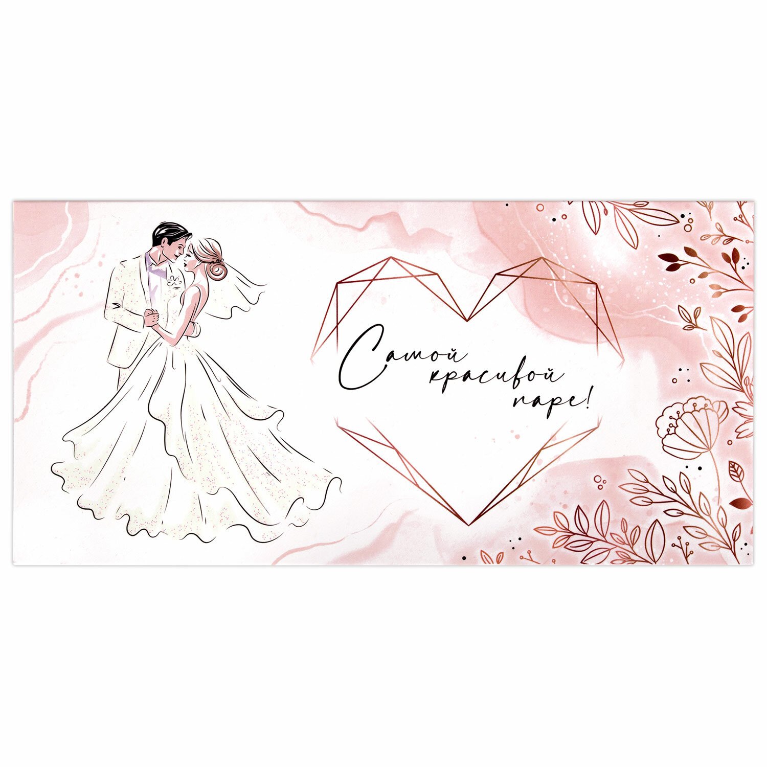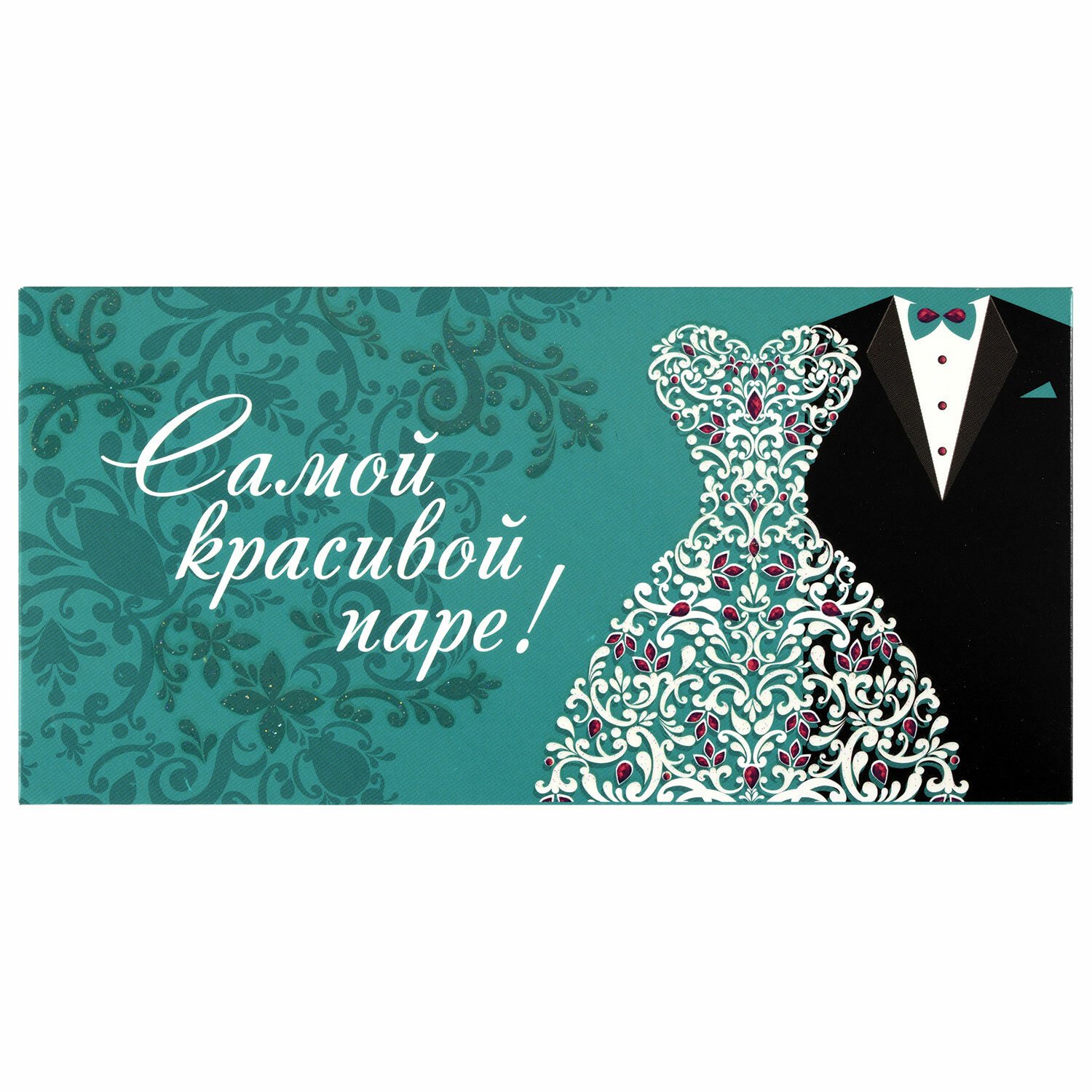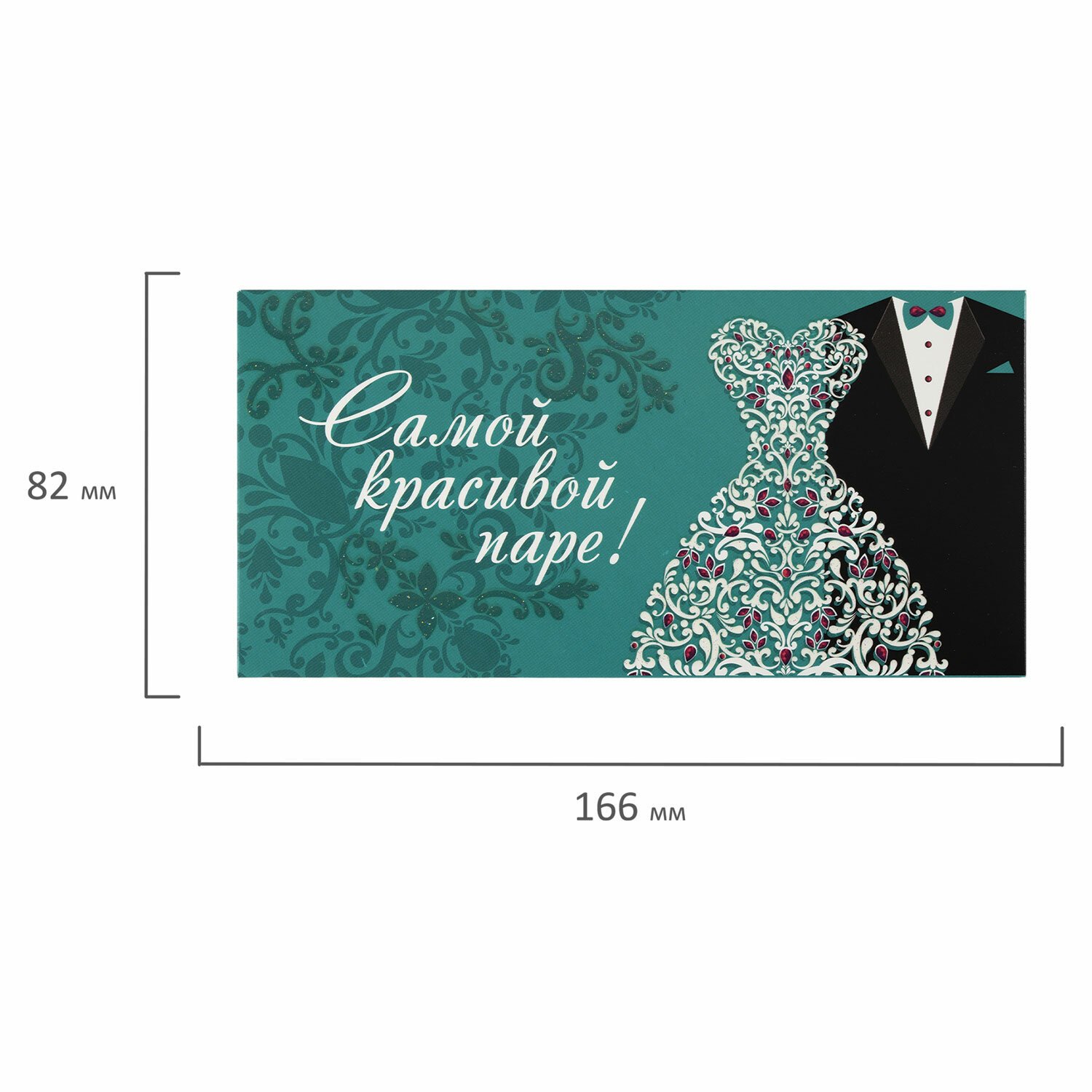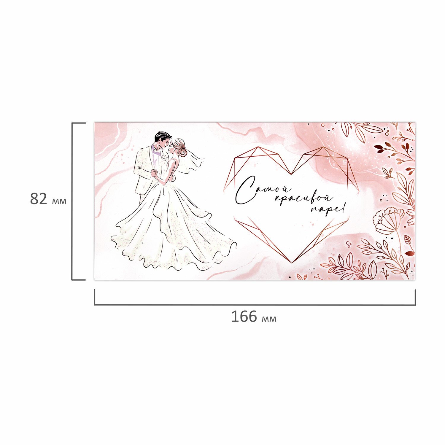 Конверт с тематическим свадебным принтом и надписью "САМОЙ КРАСИВОЙ ПАРЕ!" изготовлен из высококачественного картона плотностью 215 г/м2. Отделка - блестки. Размер – 166х82 мм.