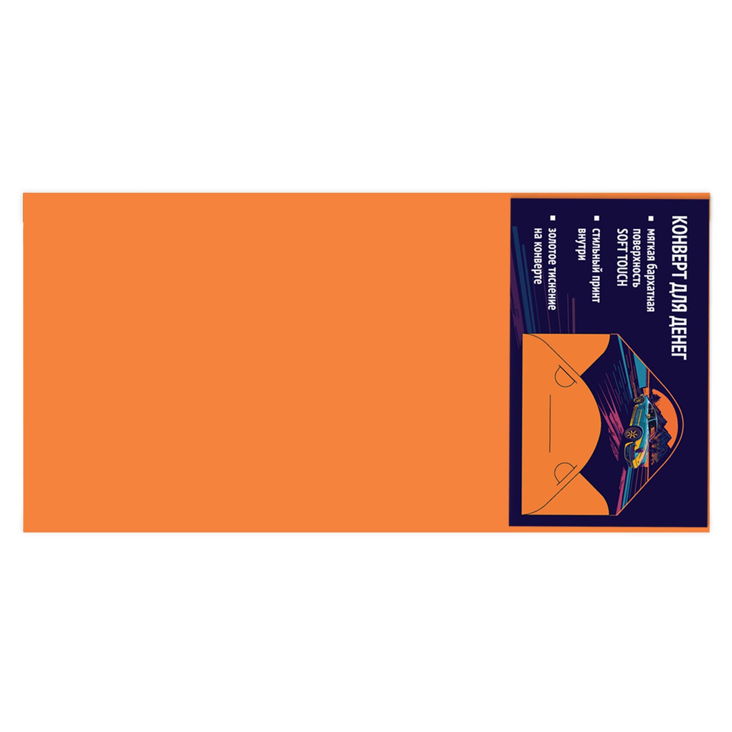 Конверт "Soft Style" изготовлен из высококачественного картона плотностью 215 г/м2. Представлен в 6 универсальных дизайнах (без возможности выбора) с эффектом soft touch. Отделка - тиснение золотой фольгой. Размер - 166х82 мм.