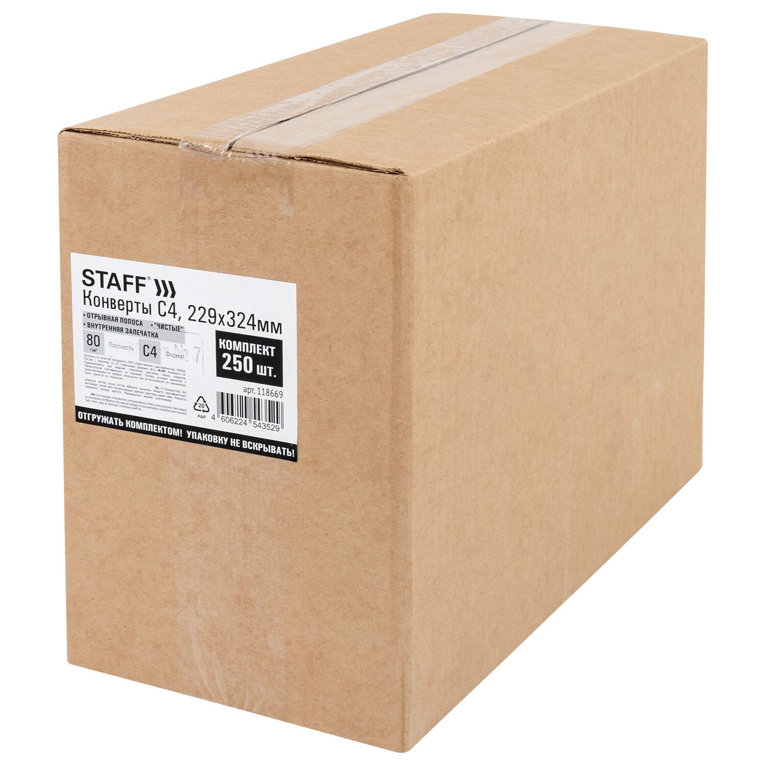 Конверты С4 (229х324мм), отрывная лента, 80г/м2, КОМПЛЕКТ 250шт, внутренняя запечатка, STAFF, 118669