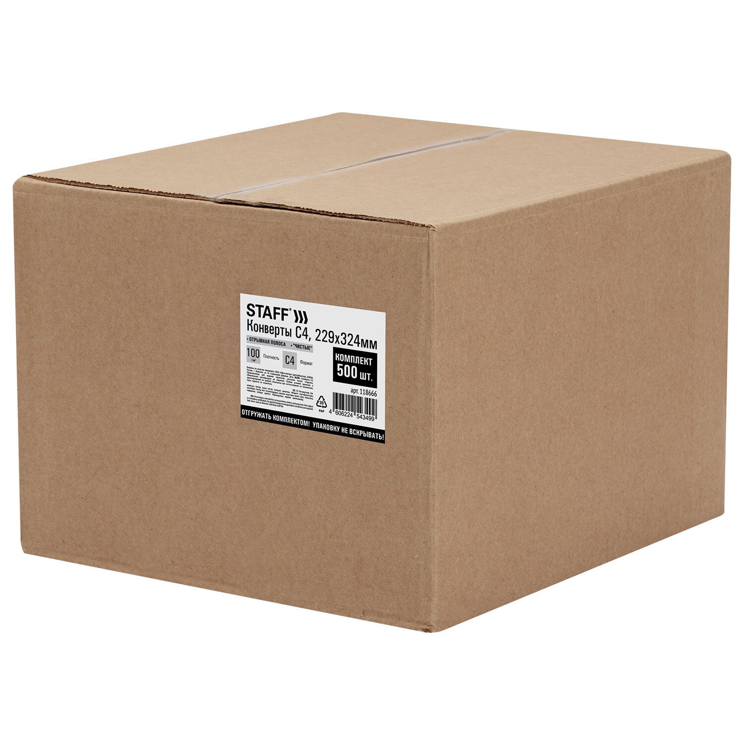 Конверты С4 (229х324мм), отрывная лента, белые, 100г/м2, КОМПЛЕКТ 500шт, STAFF, 118666