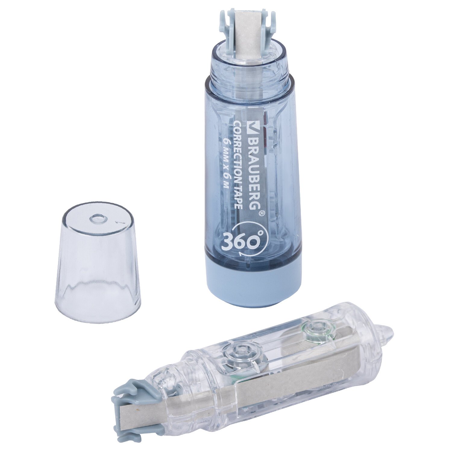 Корректирующая лента BRAUBERG 360° представлена в голубом тонированном корпусе, поставляется в комплекте со сменным картриджем 6 мм х 6 м. Длина ленты составляет 6 м, а ширина – 6 мм.