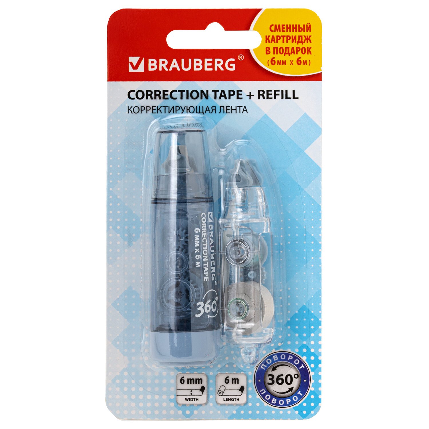 Корректирующая лента BRAUBERG 360°, 6 мм х 6 м + сменный картридж, корпус синий, блистер, 272661