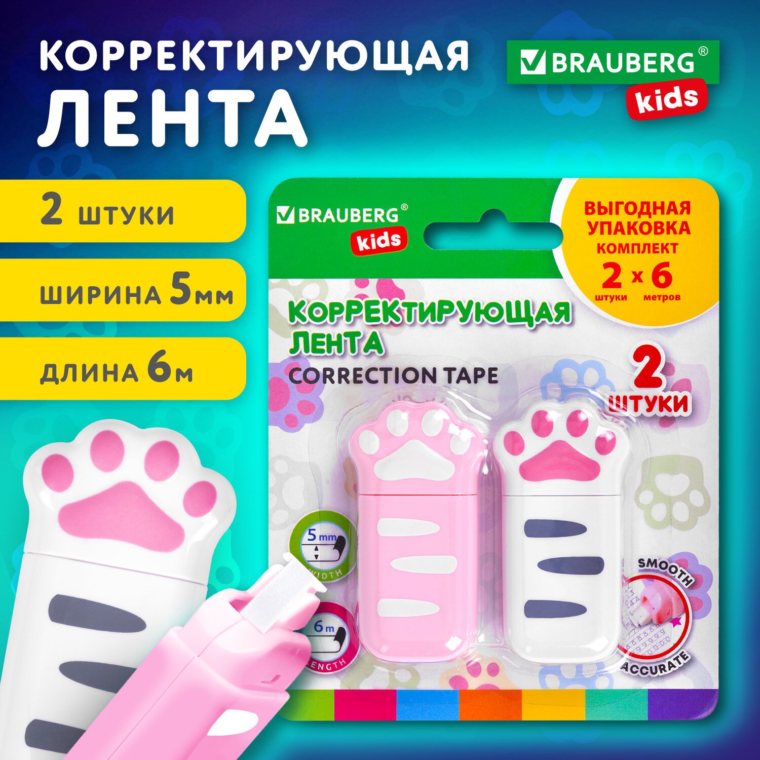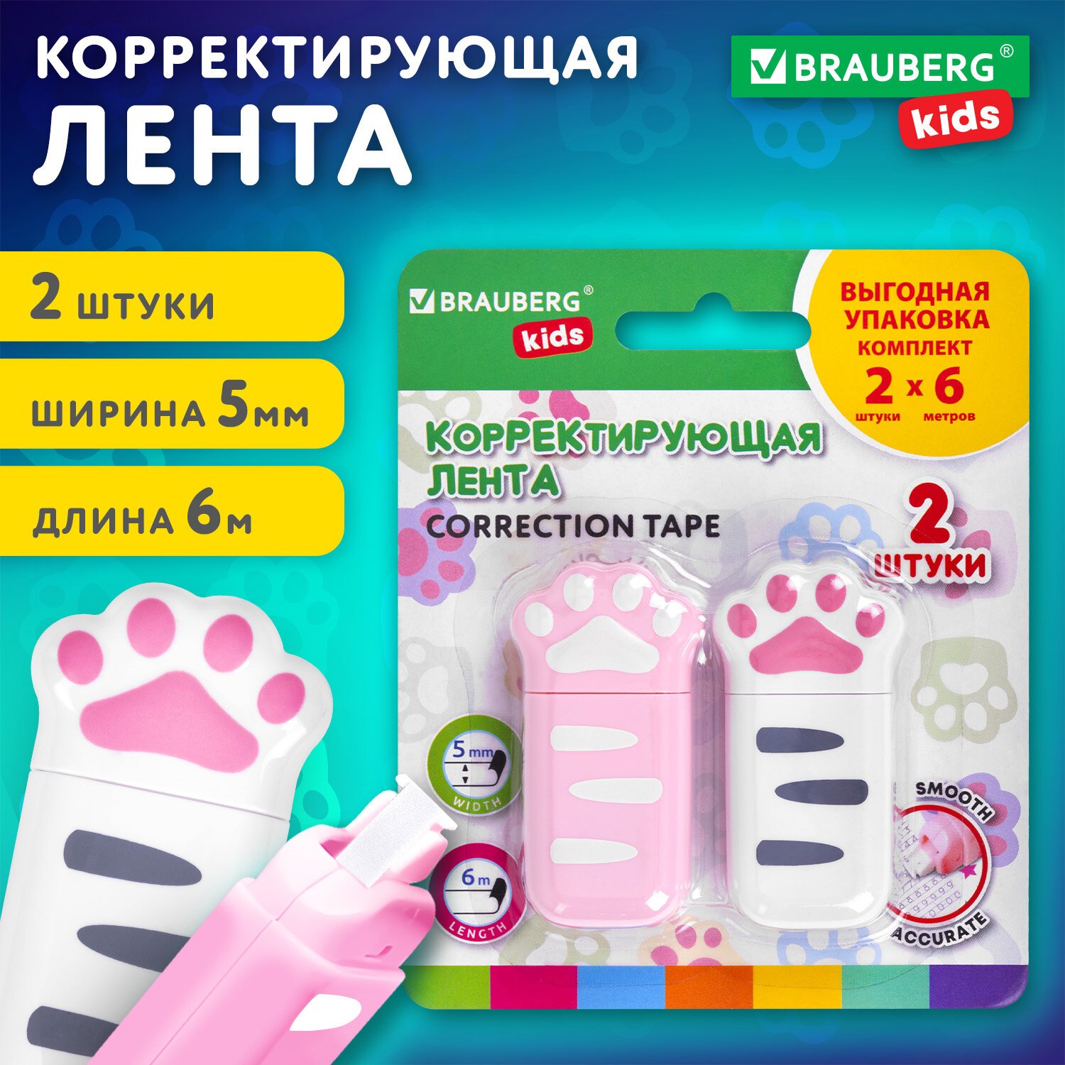 Корректирующая лента BRAUBERG KIDS "ЛАПКИ", 5 мм х 6 м, ВЫГОДНАЯ УПАКОВКА 2 штуки в блистере, 272498