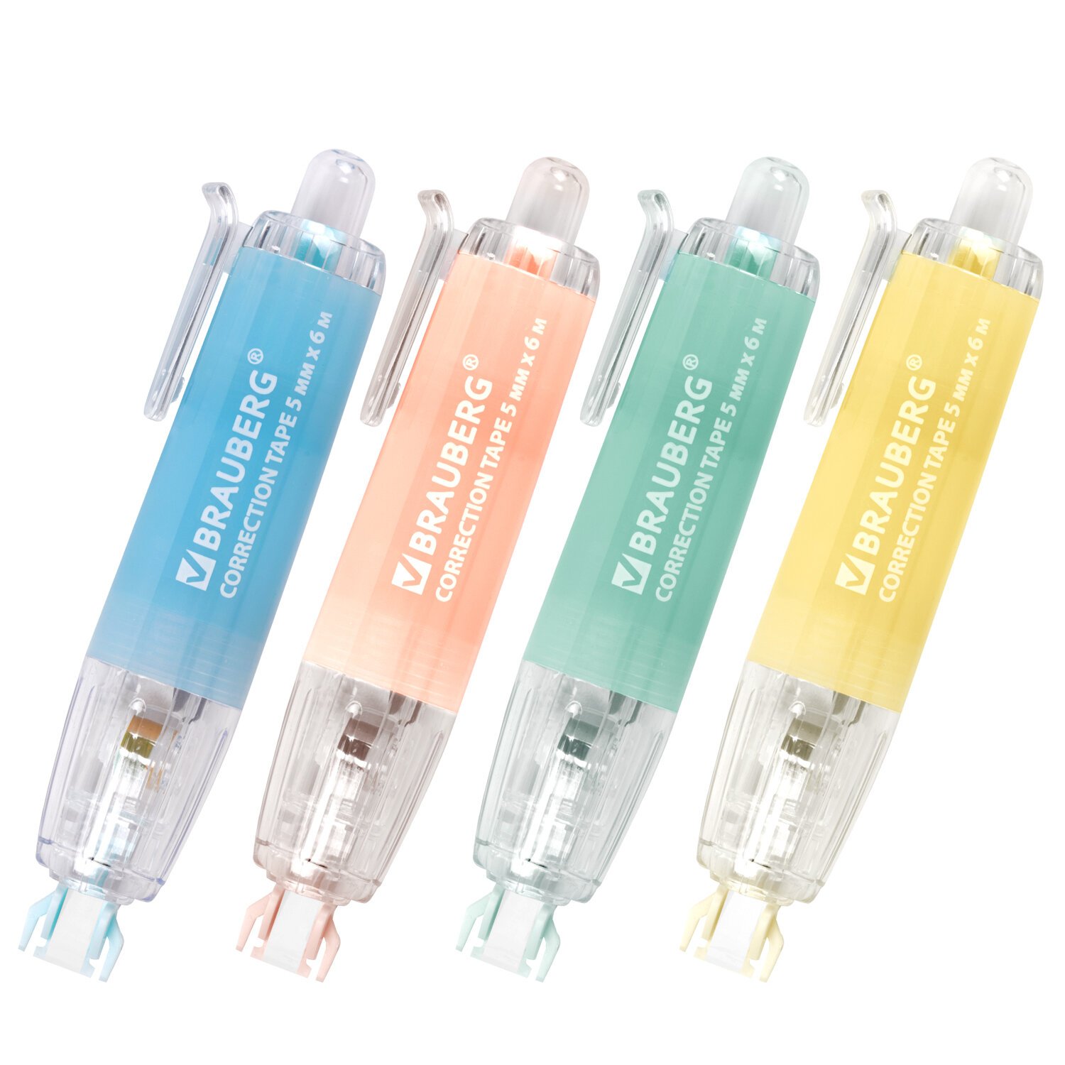 Серия корректирующих лент BRAUBERG PASTEL представлена в нежных пастельных цветовых сочетаниях. Специальный клип и автоматическая подача стержня позволяют хранить ленту даже в кармане одежды. Общая длина ленты составляет 6 м, а ширина – 5 мм. Поставляется в блистере с европодвесом.