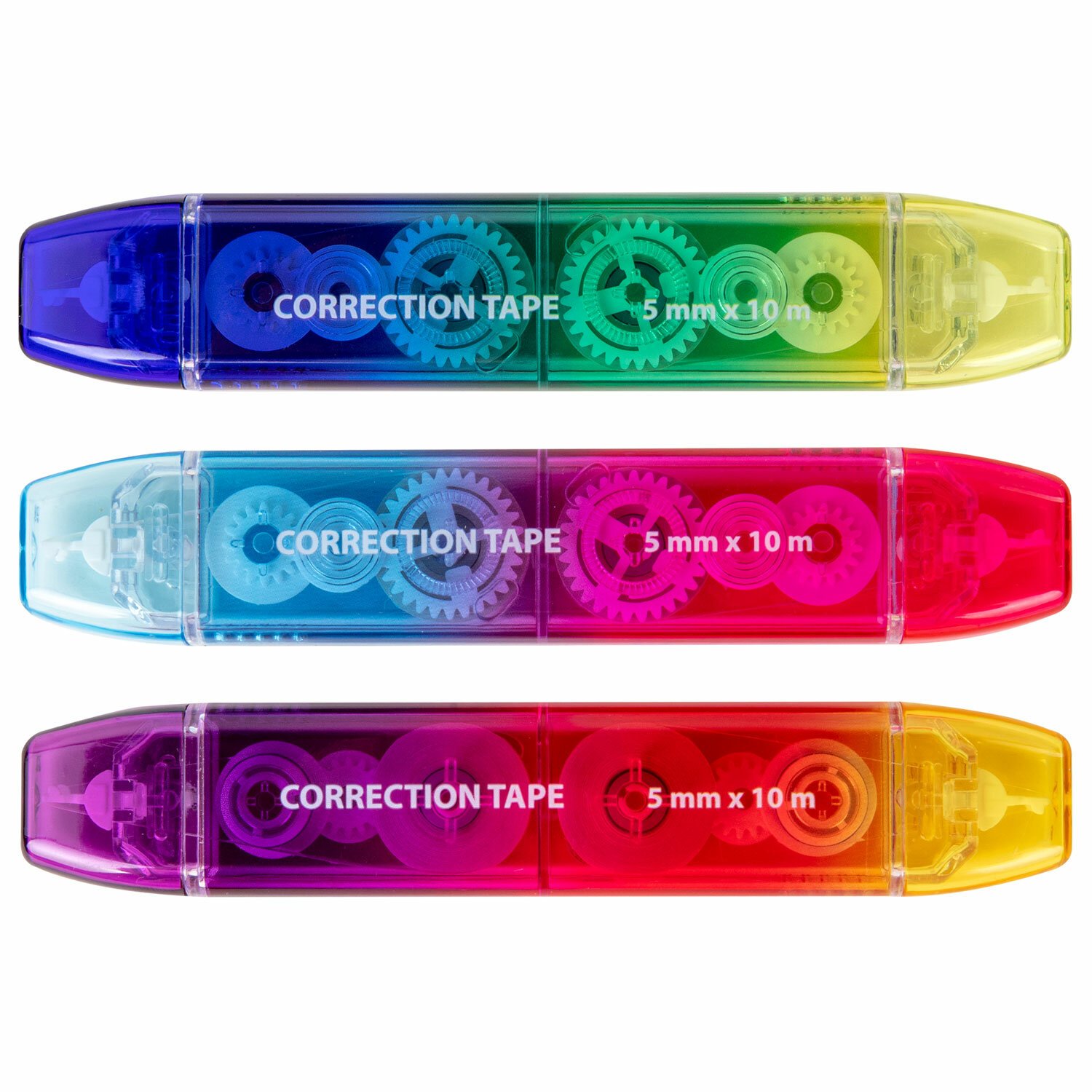 Выгодный формат упаковки – набор из 3 штук! Дизайн корпуса представлен в 3 сочных градиентных цветах: розово-голубом, сиренево-оранжевом, сине-зеленом. Подача ленты доступна с обеих сторон корпуса. Общая длина корректирующей ленты – 10 м, ширина – 5 мм.