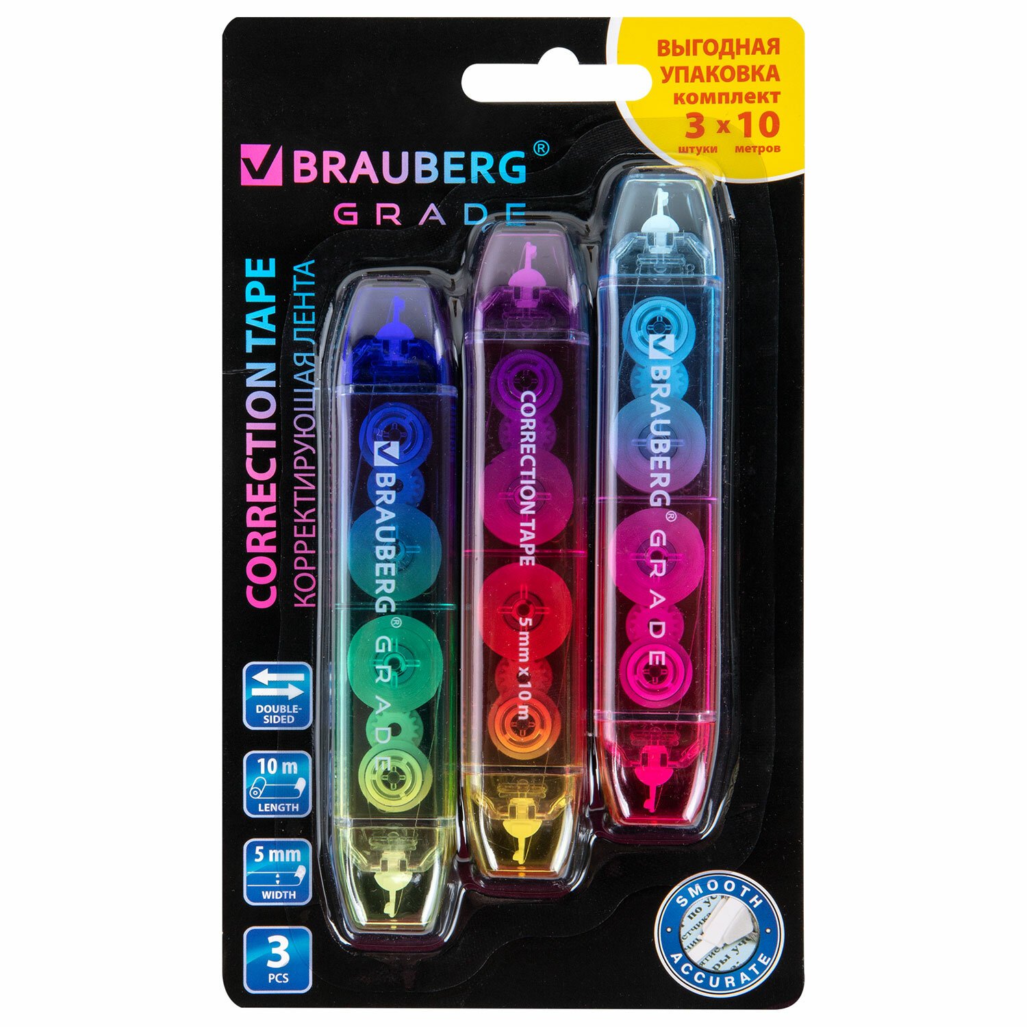 Корректирующая лента двусторонняя 5 мм x 10 м, КОМПЛЕКТ 3 штуки, BRAUBERG "Grade", блистер, 271942