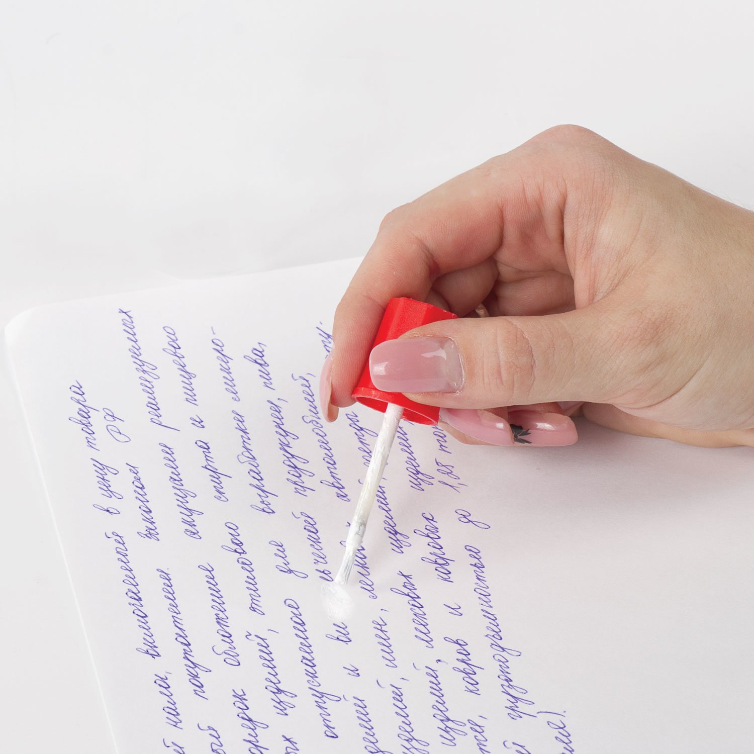 Корректор является морозоустойчивым и быстро высыхает на бумаге. Флакона объемом 20 мл хватит на продолжительное время. Кисточка позволяет легко наносить жидкость.