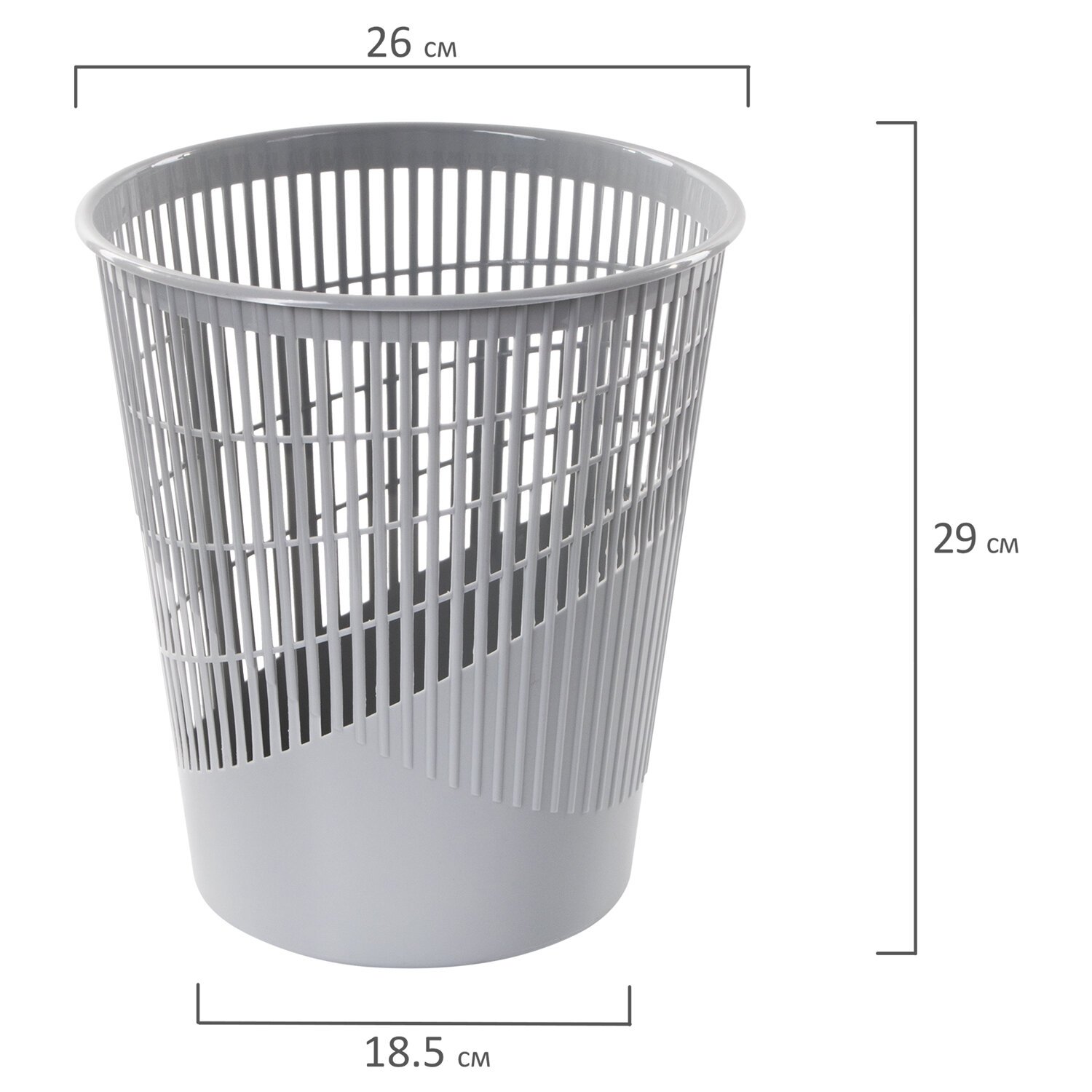 Изготовлена из высококачественного пластика серого цвета. Корпус расширяется к верху: диаметр основания составляет 18,5 см, а диаметр верхней части – 26 см. Высота – 29 см, объем – 11 л. Легкость и компактность корзины позволяют перемещать ее с одного места на другое. Корзина удобно помещается под рабочим столом. Рекомендуемый размер мешка для мусора – 45х56 см, объем – до 18 литров.