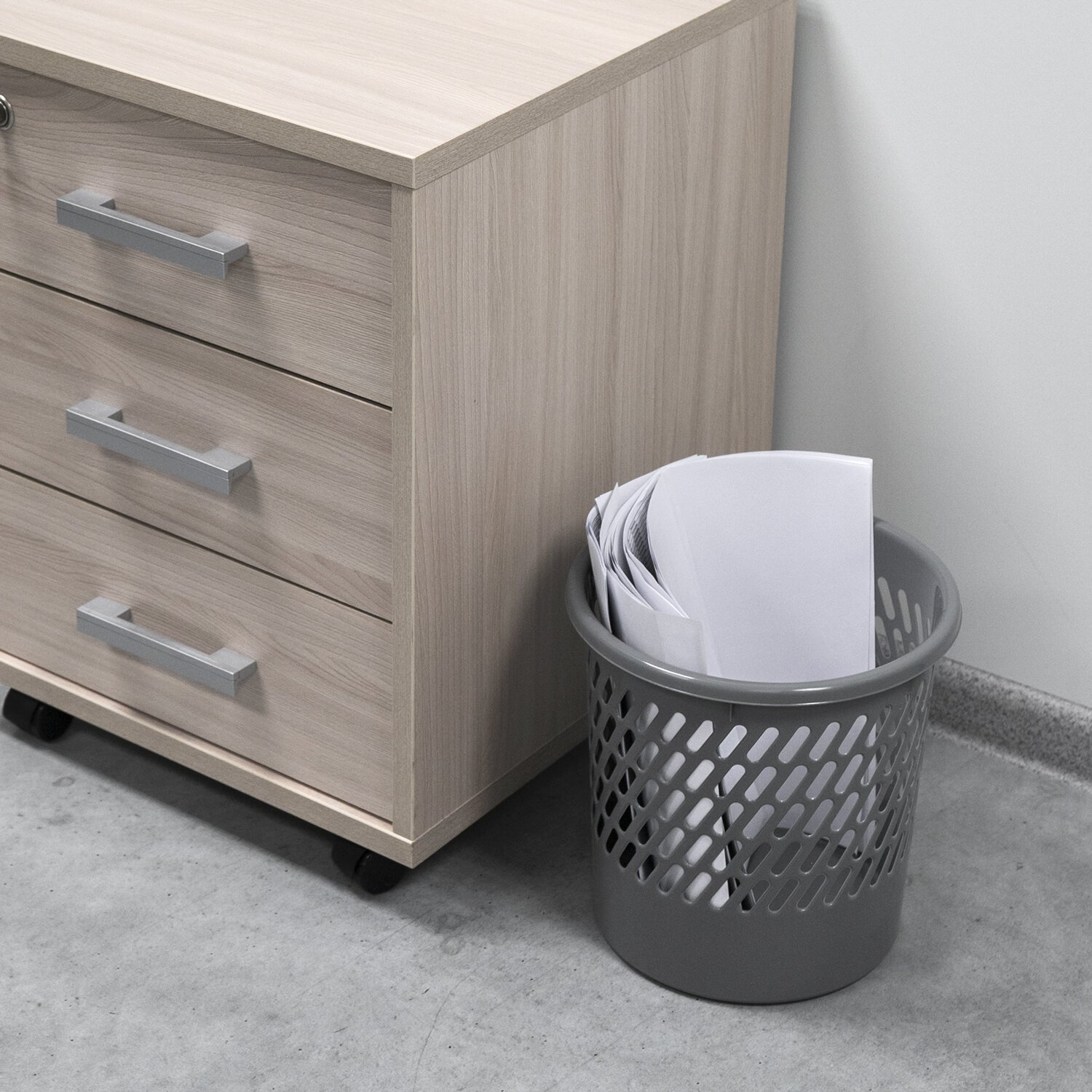 Изготовлена из высококачественного пластика серого цвета. Корпус расширяется к верху: диаметр основания составляет 19,7 см, а диаметр верхней части – 26 см. Высота – 27 см, объем – 11 л. Легкость и компактность корзины позволяют перемещать ее с одного места на другое. Изделие удобно помещается под рабочим столом. Рекомендуемый размер мешка для мусора – 45х56 см, объем – до 18 литров.