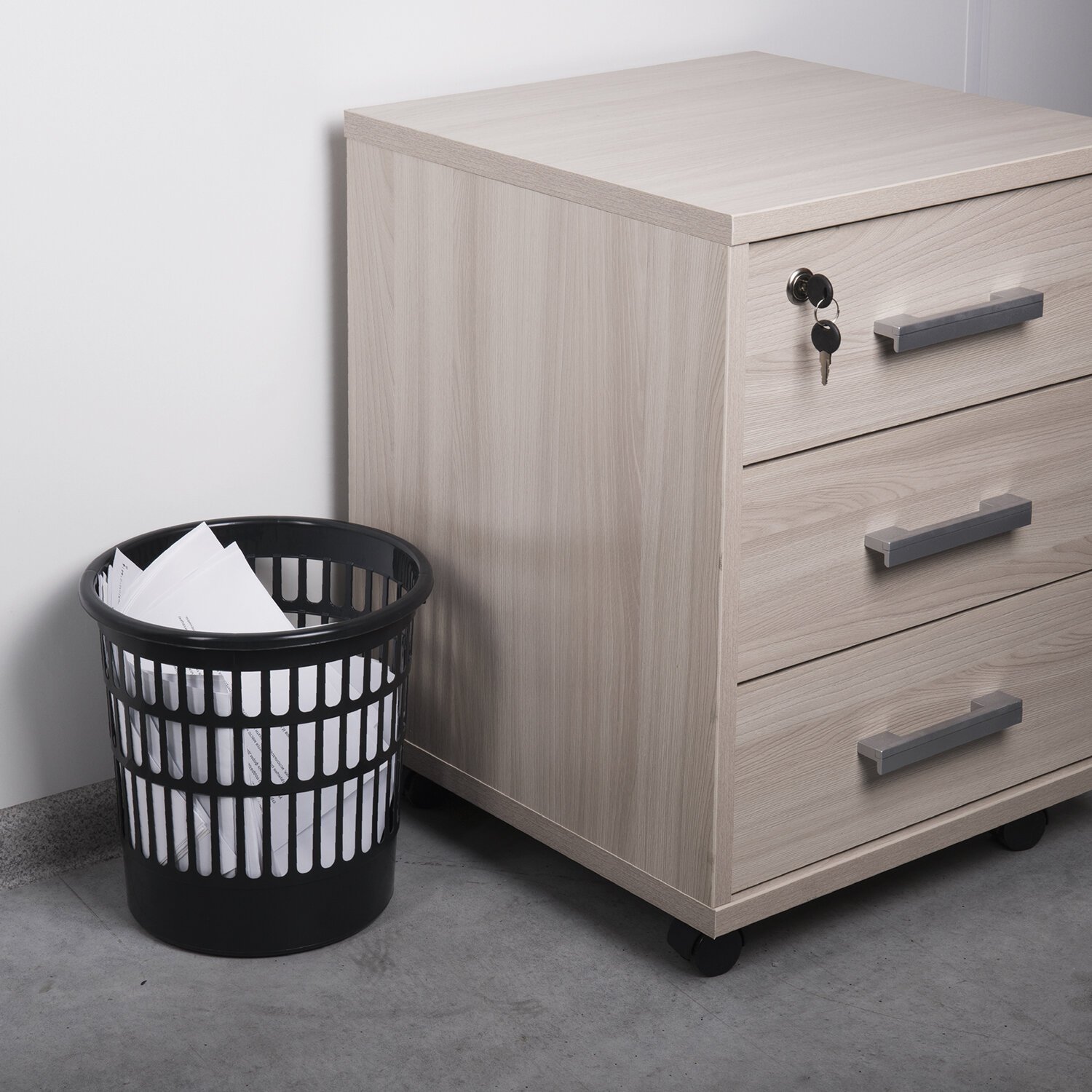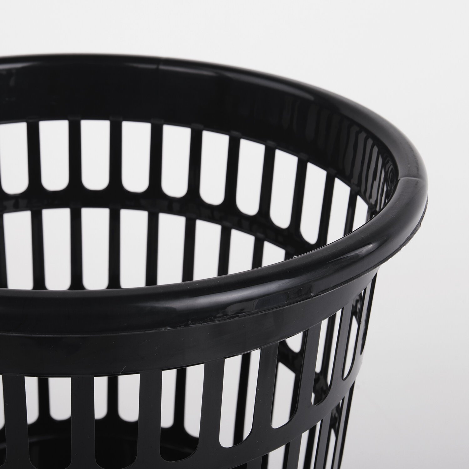 Изготовлена из высококачественного пластика черного цвета. Корпус слегка расширяется кверху: диаметр основания составляет 19,7 см, а диаметр верхней части – 26 см. Высота – 26,5 см. Легкость и компактность корзины позволяют перемещать ее с одного места на другое. Изделие легко помещается под рабочим столом. Рекомендуемый размер мешка для мусора – 32х55 см, объем – до 12 литров.