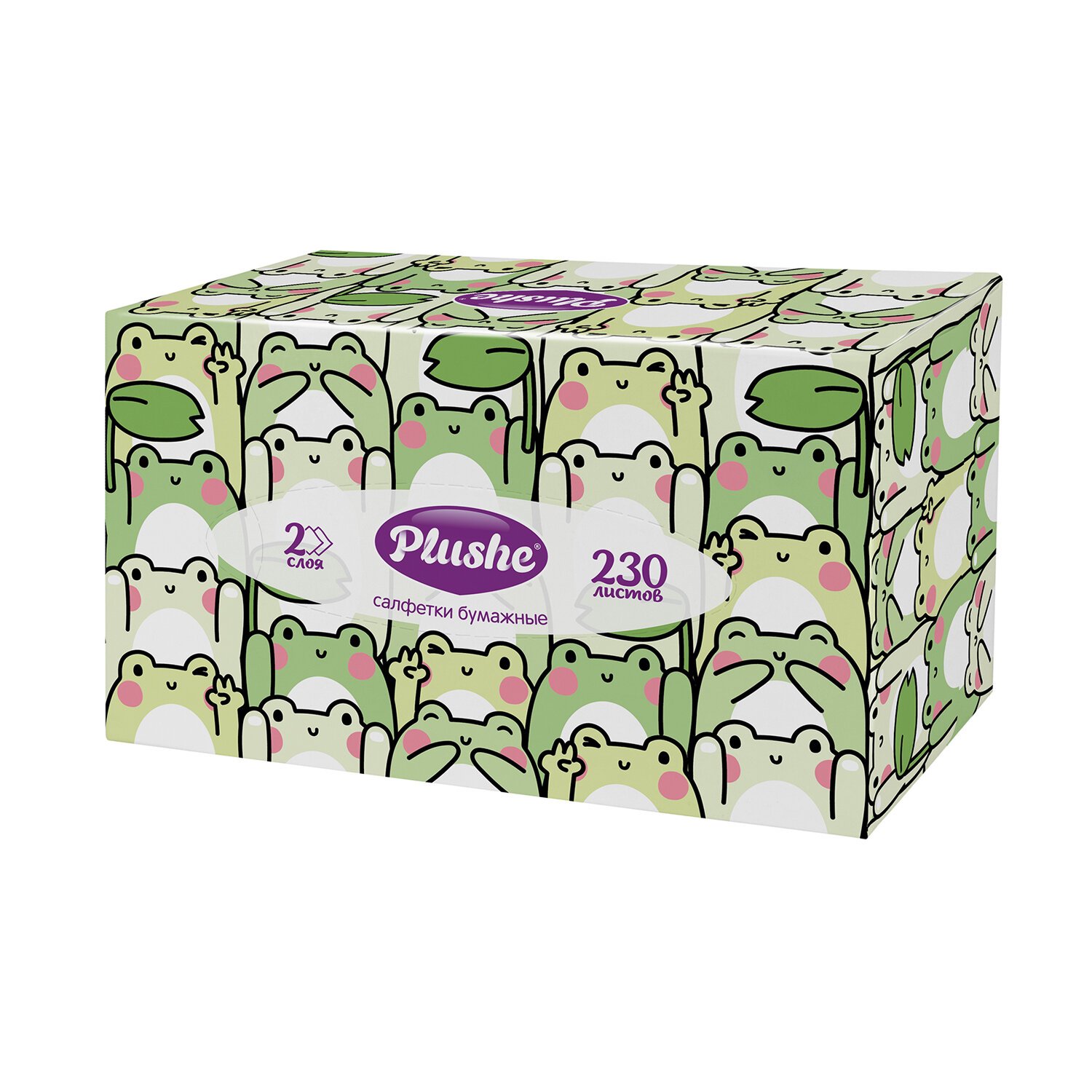 Бумажные салфетки, надежно хранятся в коробочках по 230 штук. Салфетки Plushe изготовлены из 100% первичной целлюлозы, что делает их мягкими и гипоаллергенными. Удобный формат упаковки отлично разместится, как на кухонном столе, так и в детской комнате.