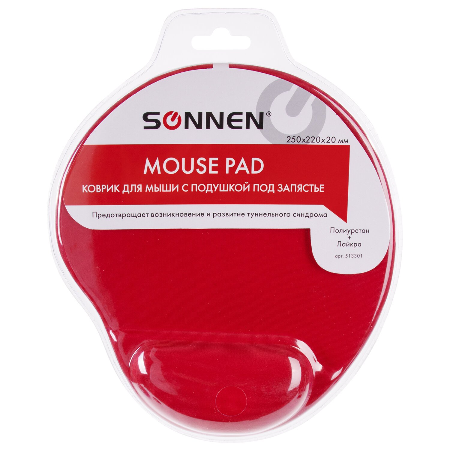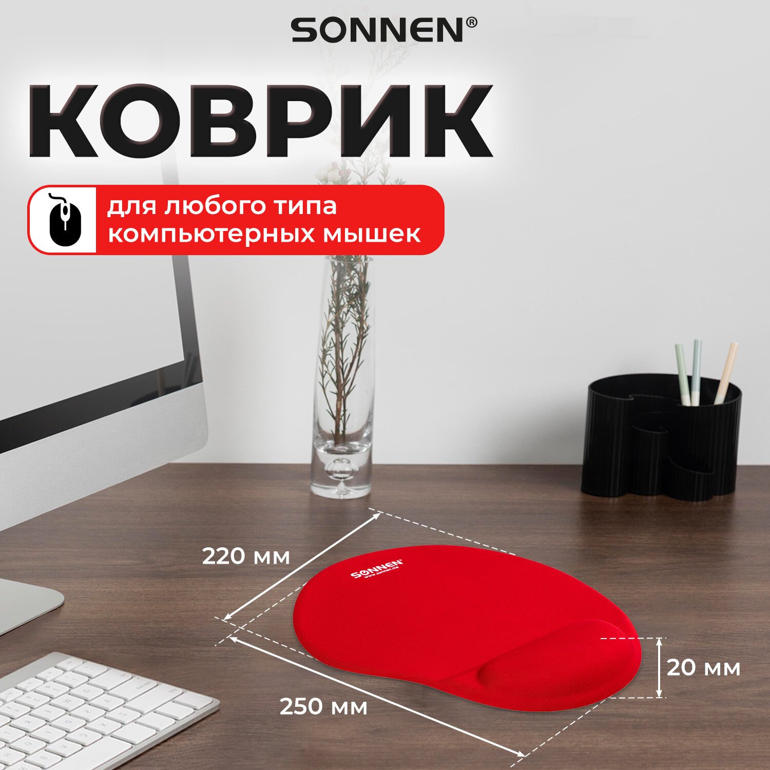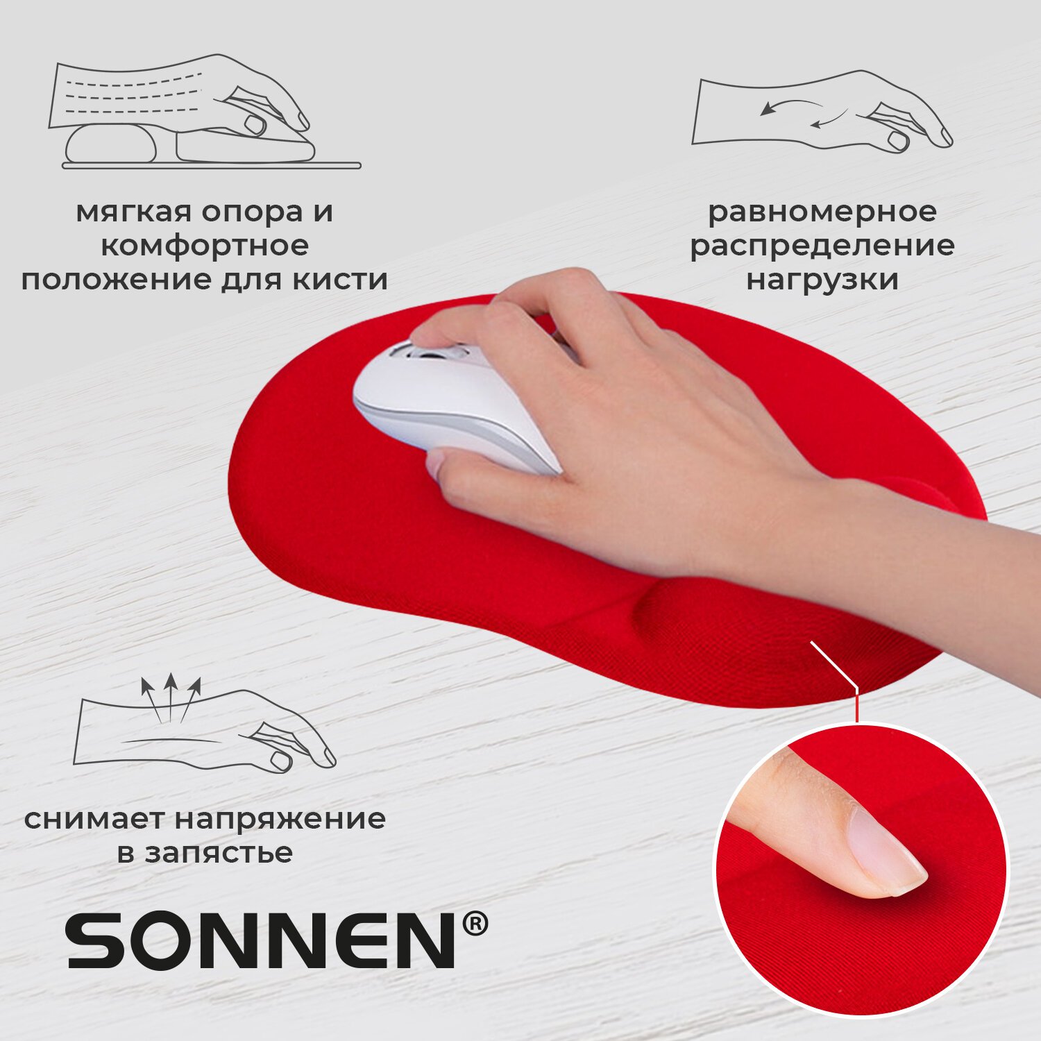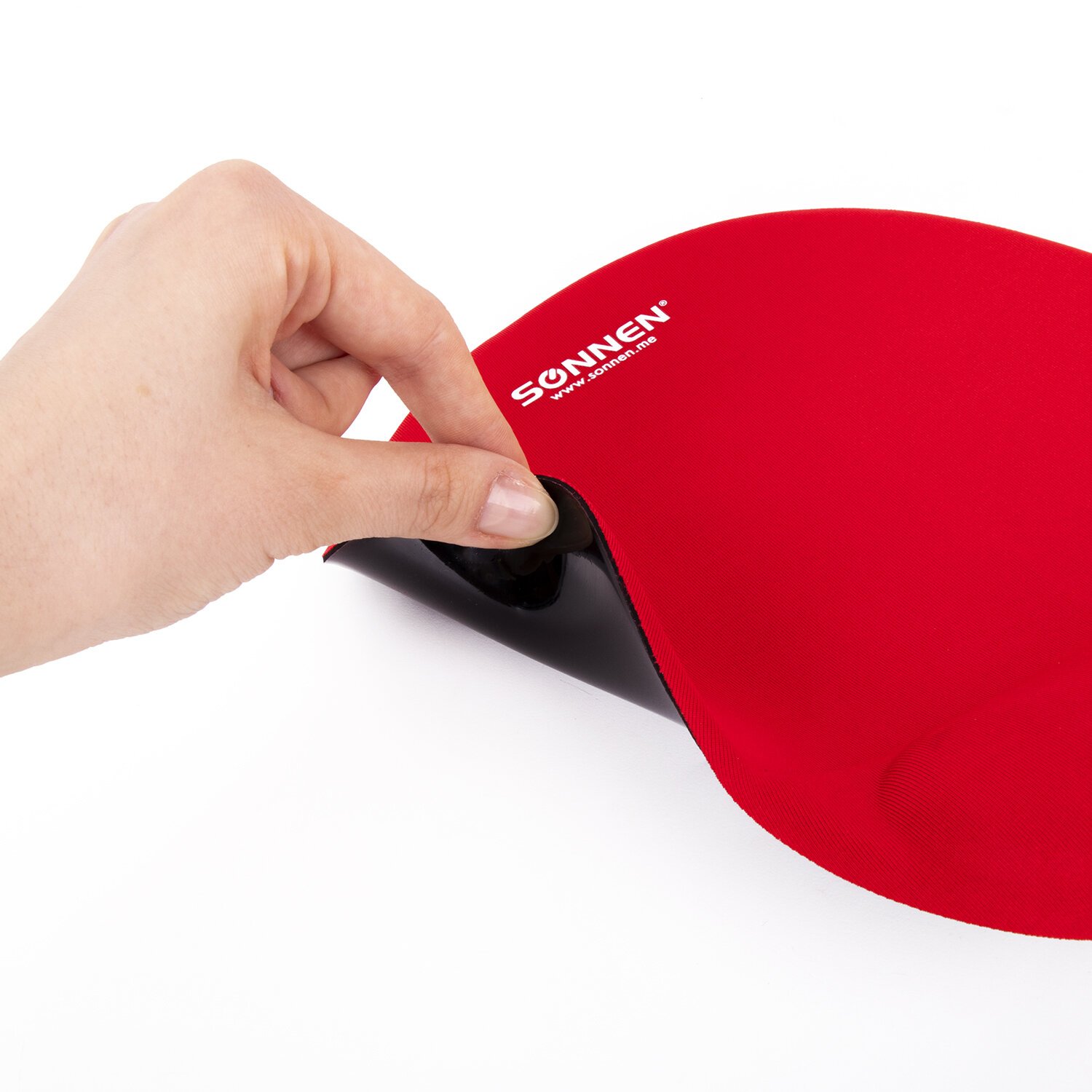 Коврик для мыши с подушкой под запястье SONNEN, полиуретан + лайкра, 250х220х20 мм, красный, 513301