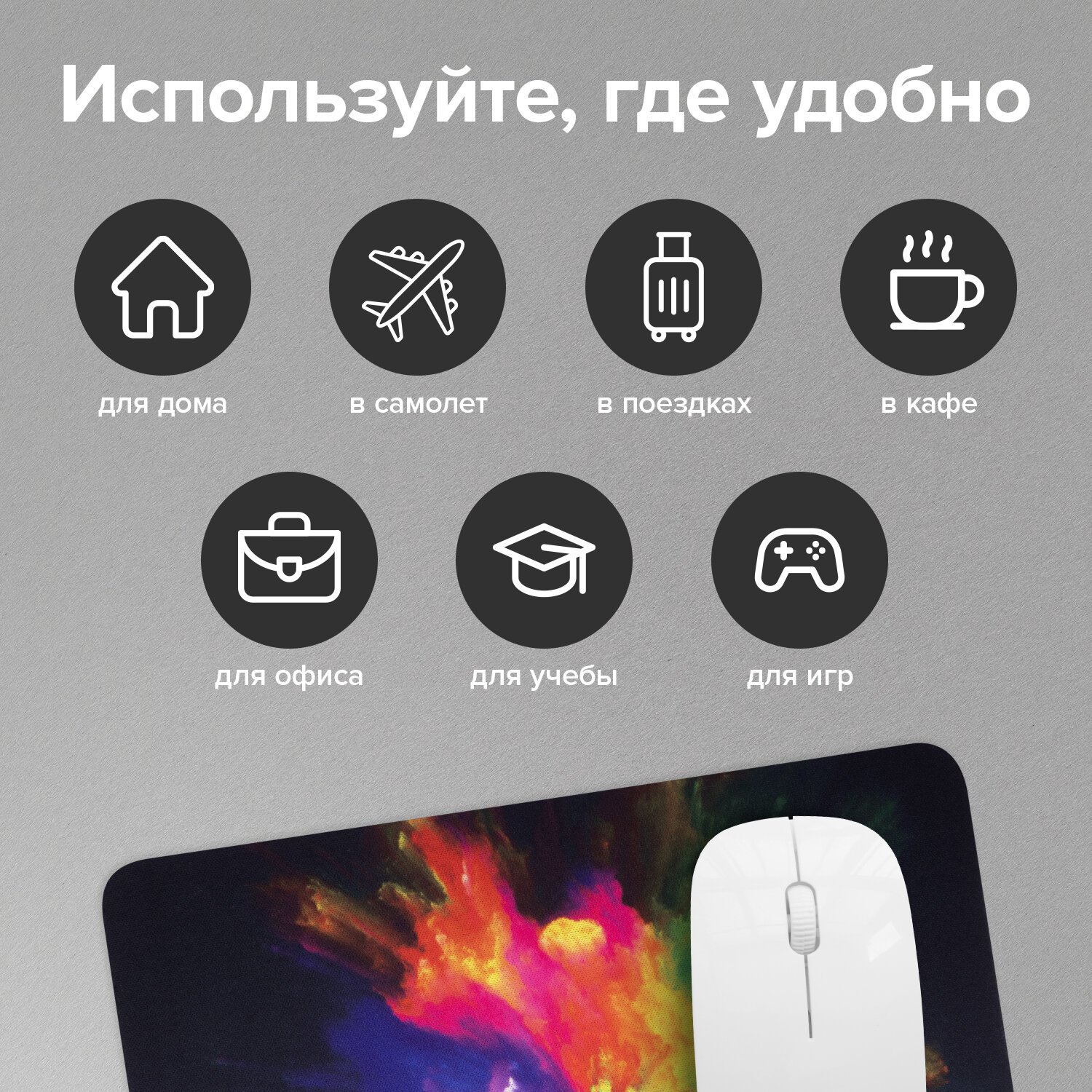 Прорезиненное основание надежно фиксирует аксессуар на столе. Благодаря компактным размерам этот привлекательный в плане дизайна коврик для мыши удобно переносить в компьютерной сумке.