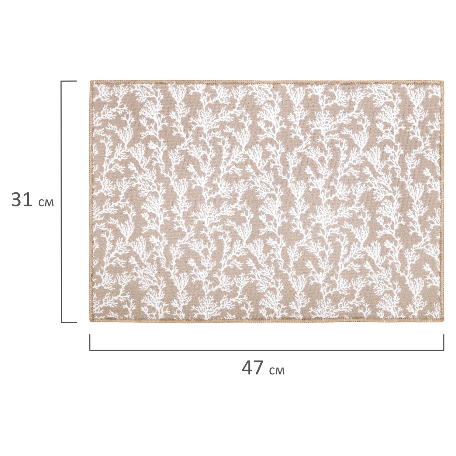 Внешние стороны коврика изготовлены из микрофибры с суммарной плотностью 440 г/м2. Края обработаны оверлоком, что гарантирует долговечность и отсутствие распускания даже после многократных стирок. Толщина – 5 мм. Размер коврика - 31x47 см - оптимален для размещения на ограниченном пространстве, но при этом позволяет сушить сразу несколько тарелок или крупную кухонную утварь. Форма коврика – прямоугольная.