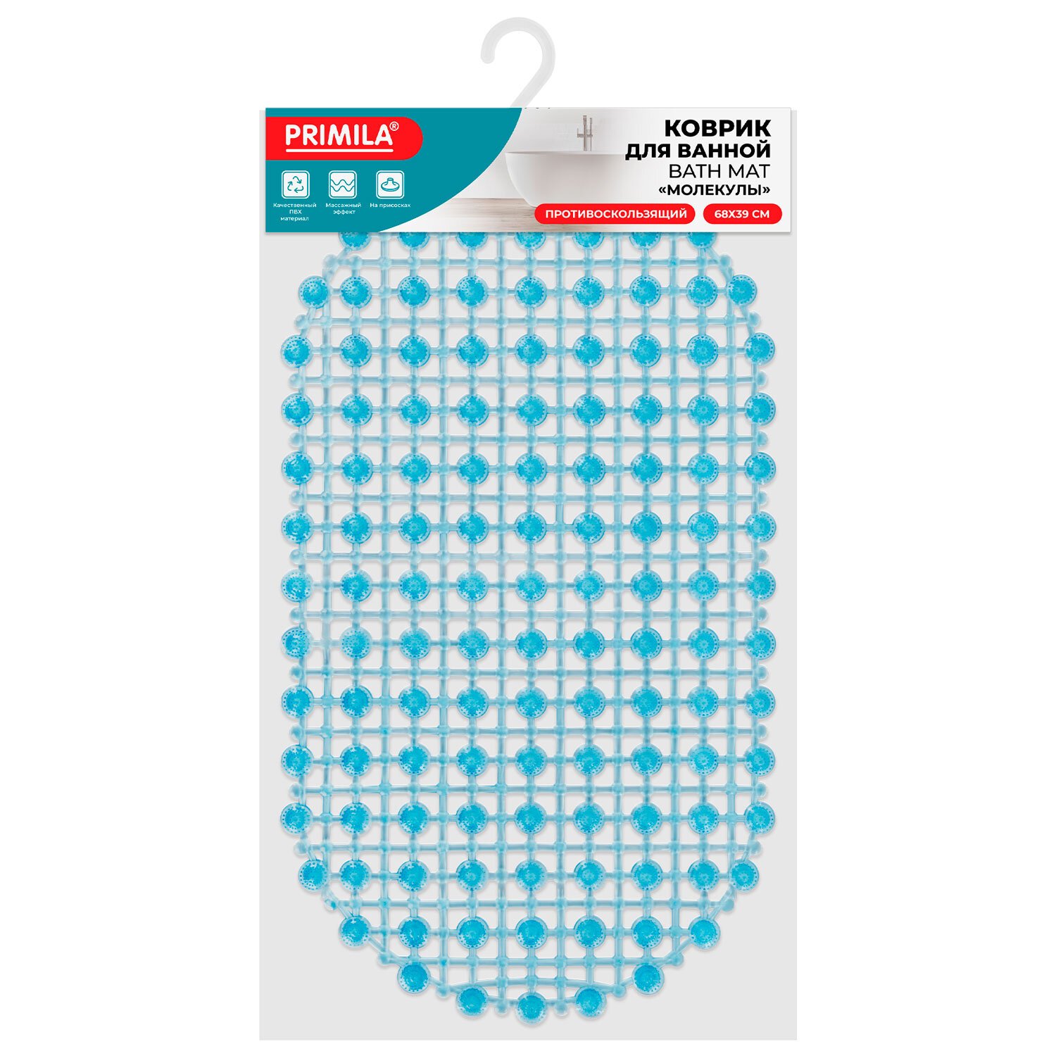 Коврик для ванны противоскользящий 68х39см, "Молекулы", овальный, голубой, ПВХ, PRIMILA, 700388