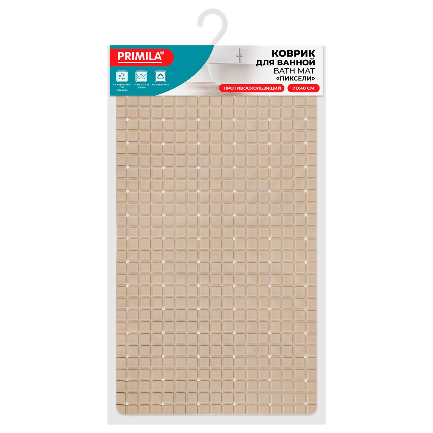 Коврик для ванны противоскользящий 71х40см, "Пиксели", бежевый, ПВХ, присоски, PRIMILA, 700383