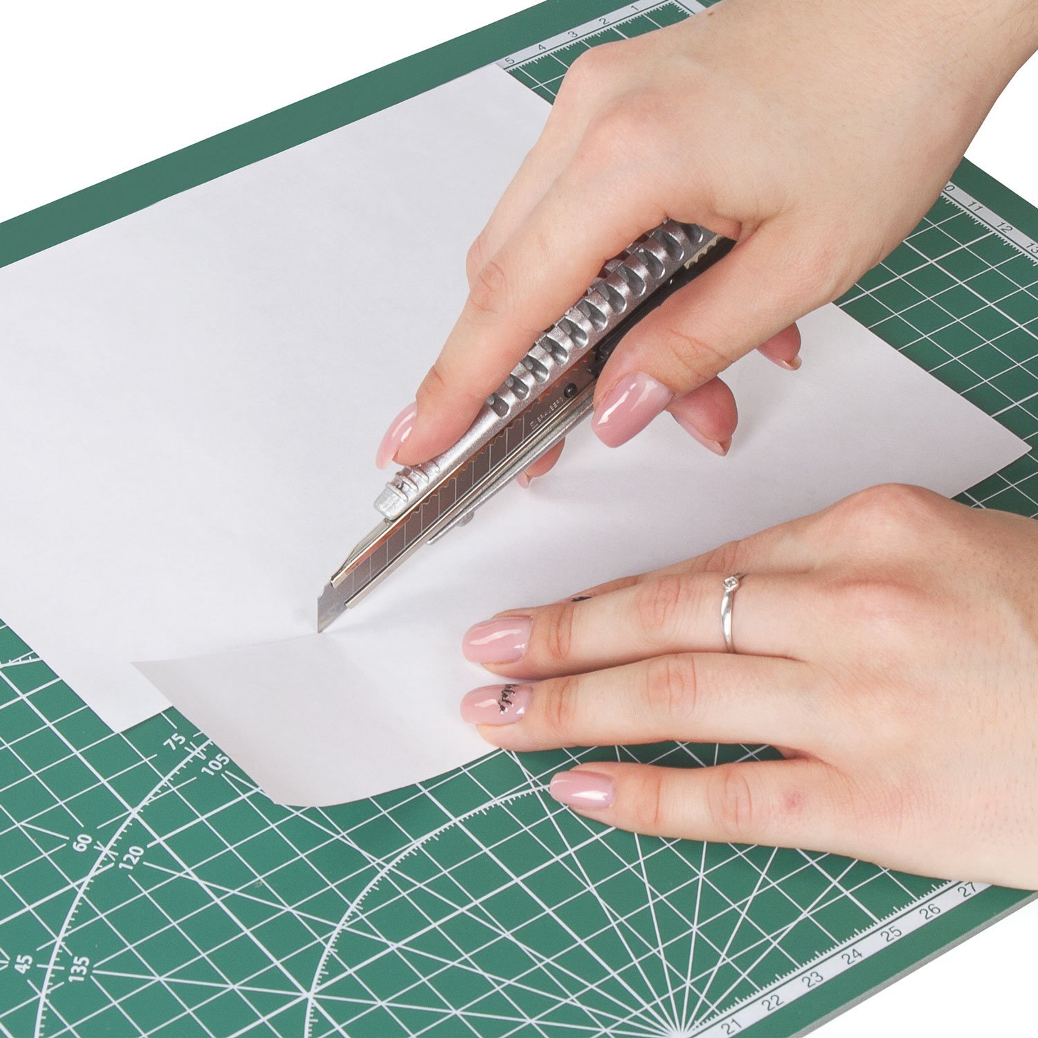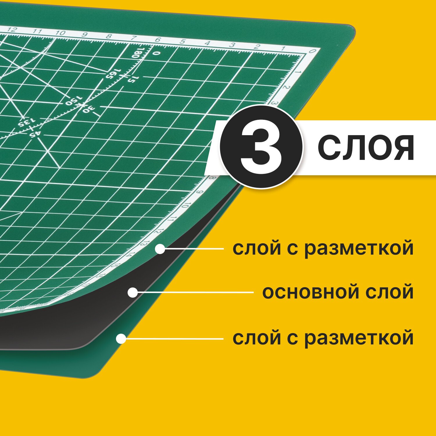 Мат формата А4 выполнен из пластика толщиной 3 мм и имеет трехслойную структуру. Одна сторона коврика имеет разметку в сантиметрах, а другая - такую же сантиметровую разметку с добавлением фигур в виде транспортира.