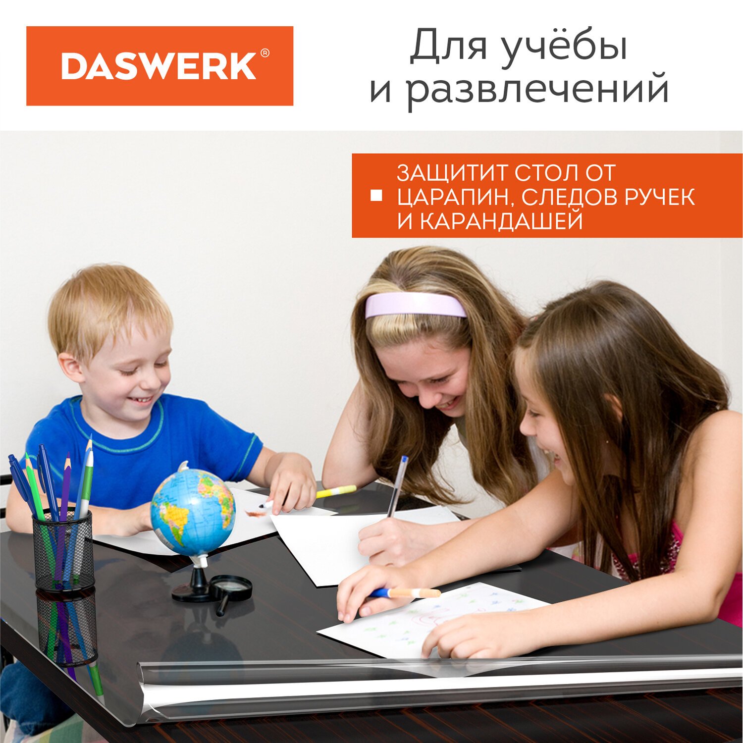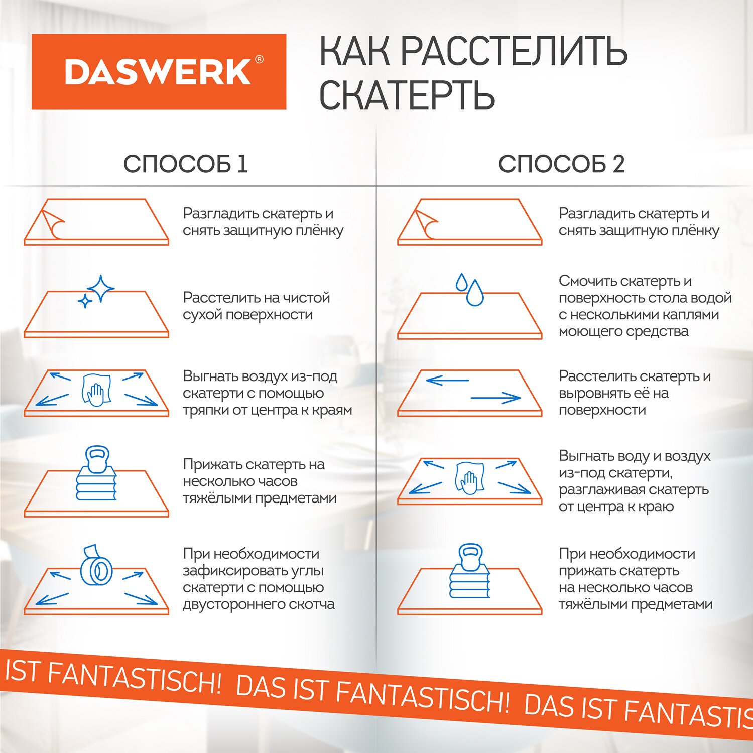 Скатерть клеенка на стол DASWERK удобна и практична для многоразового использования. Скатерть на стол (пленка на стол прозрачная) незаменима дома, в офисе, в местах общественного питания, а также для мероприятий на открытом воздухе.