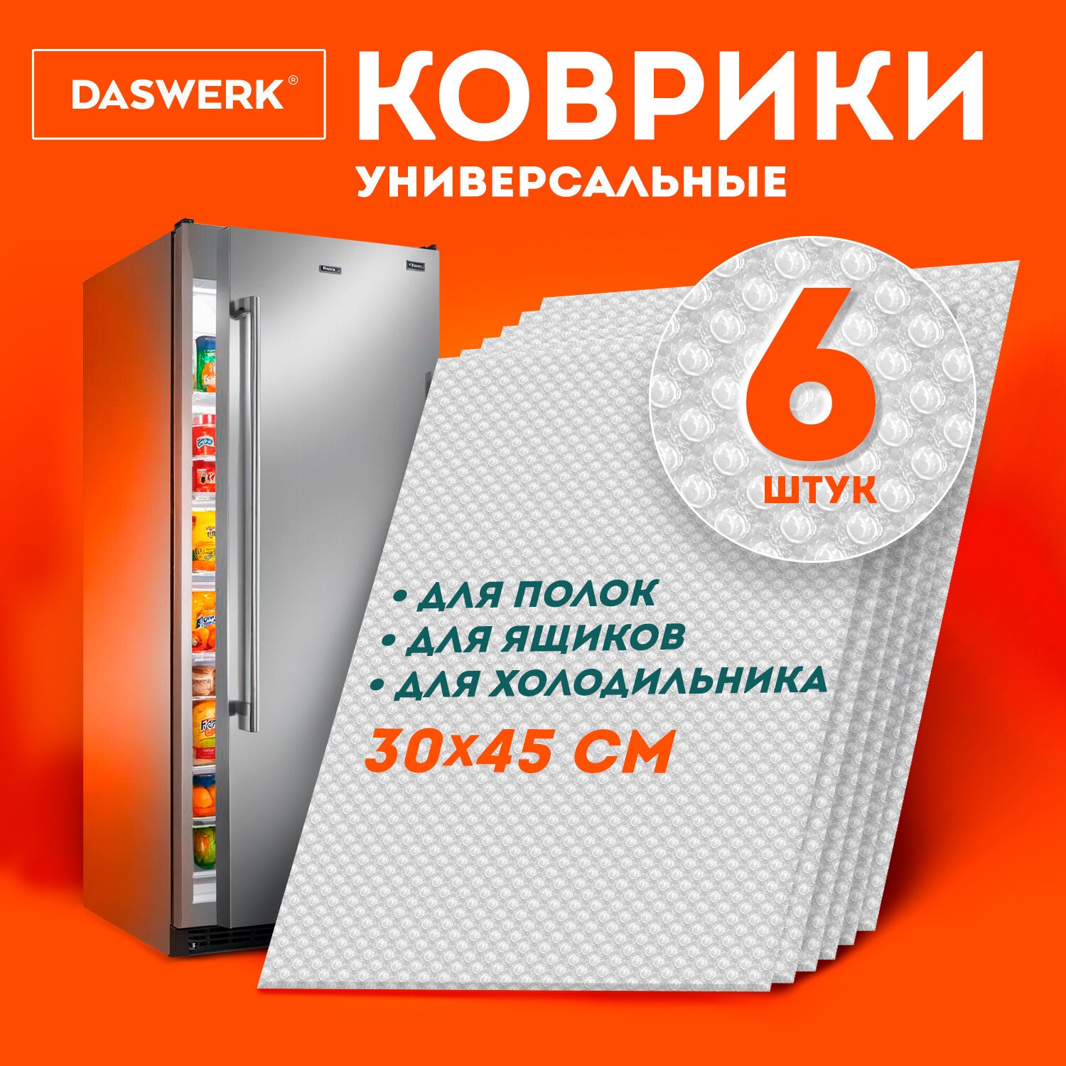 Коврики универсальные 6 шт., 30х45 см, для холодильника, полок, сервировки, прозрачный, DASWERK, 609604