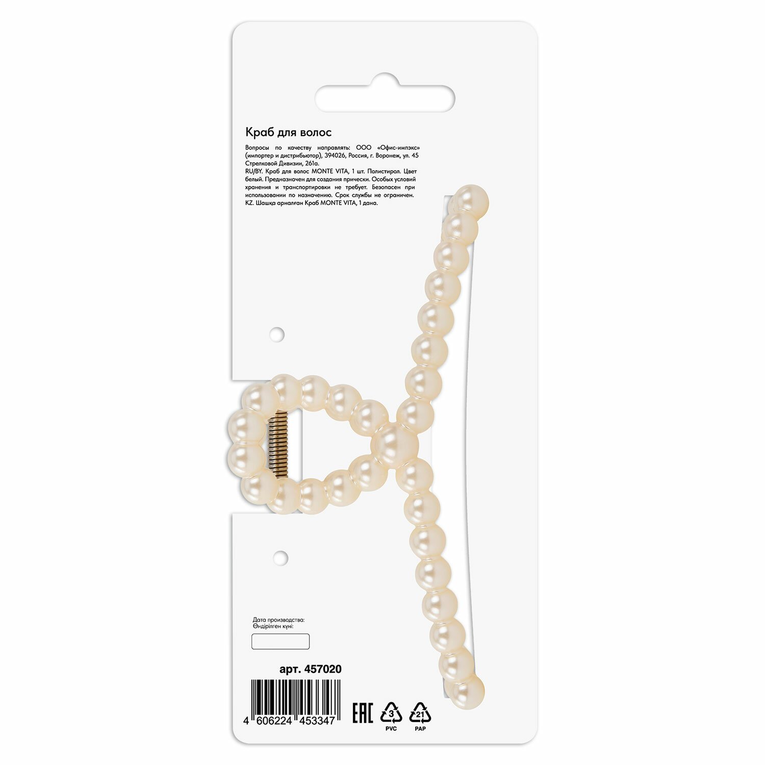 Жемчужный краб из белого полистирола с глянцевым покрытием — аксессуар для особых случаев. Удлиненный размер (13 см) создает эффект объема, а декор в виде жемчужины добавляет образу роскошь.