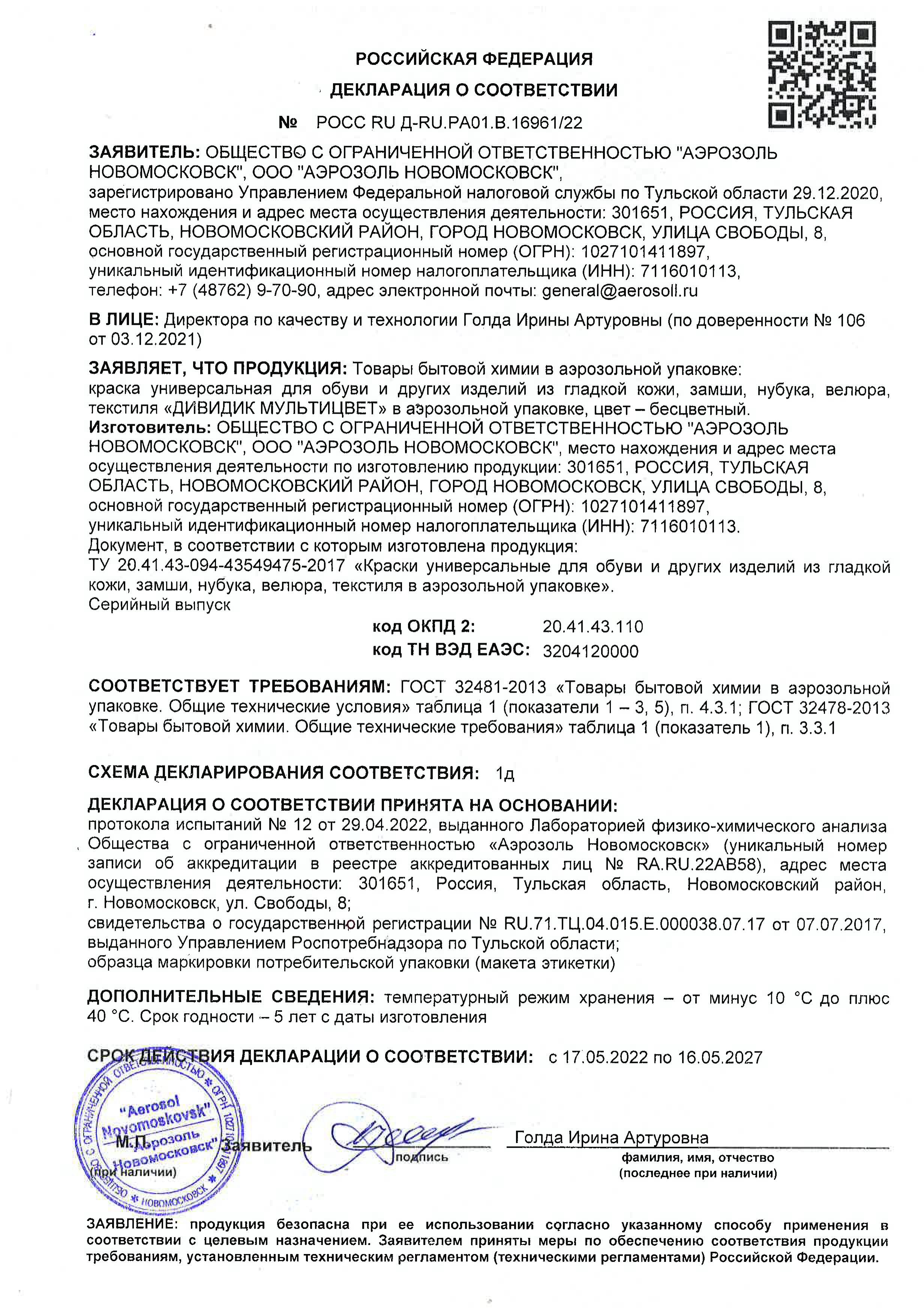 Краска аэрозольная для обуви бесцветная универсальная 250 мл, ДИВИДИК, 4600104034541