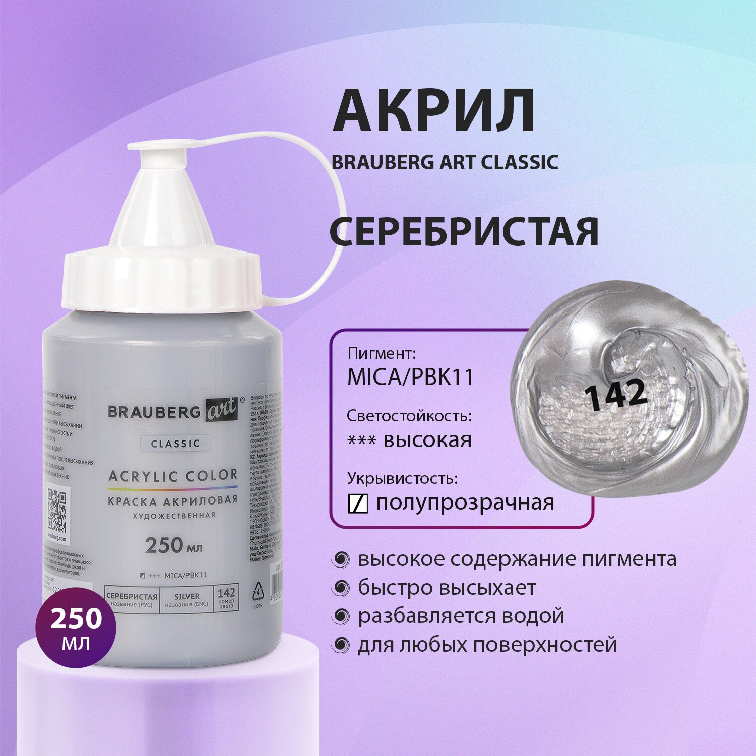 Краска акриловая художественная BRAUBERG ART CLASSIC, флакон 250 мл, СЕРЕБРИСТАЯ, 191715