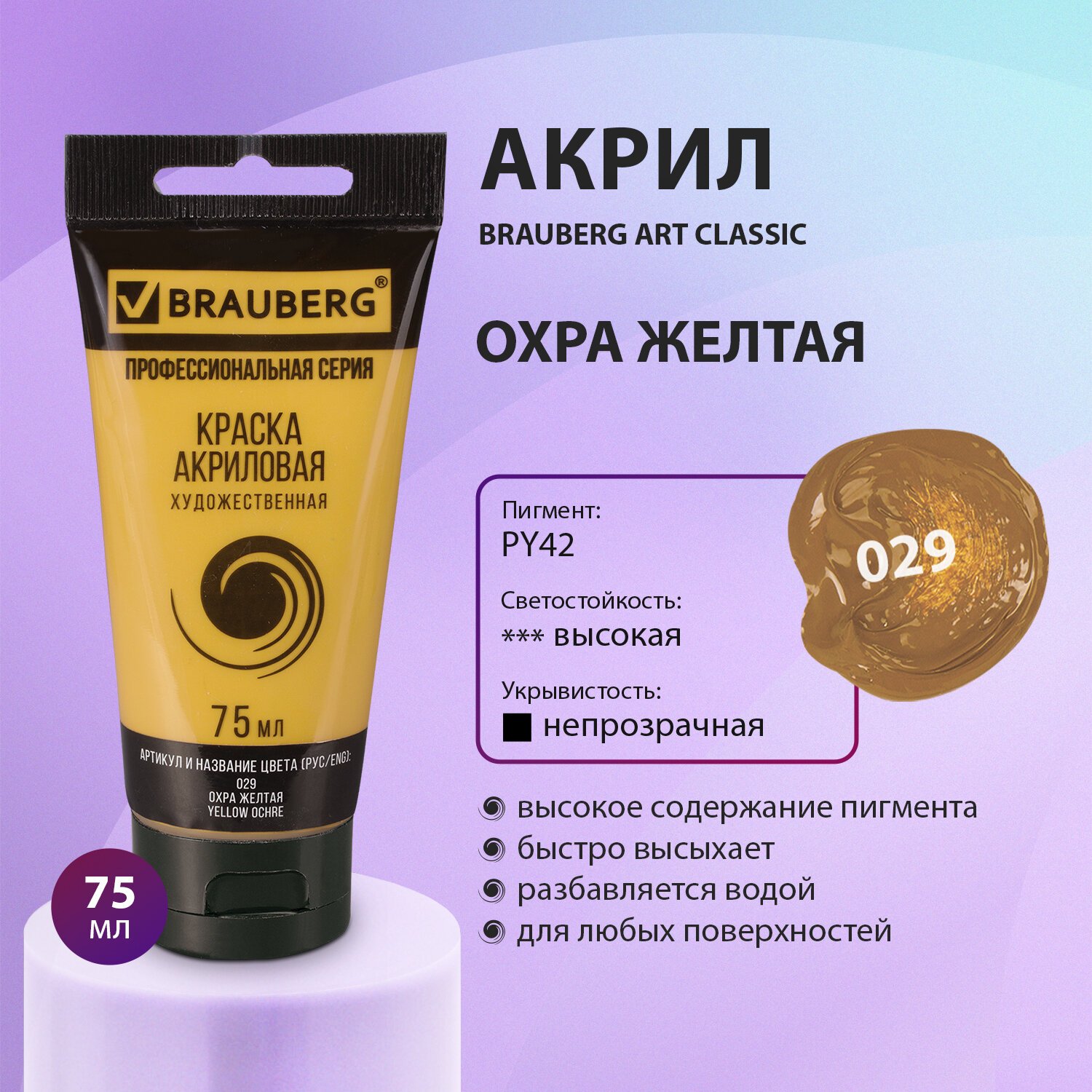 Краска акриловая художественная BRAUBERG ART CLASSIC, туба 75 мл, ОХРА ЖЕЛТАЯ, 191110