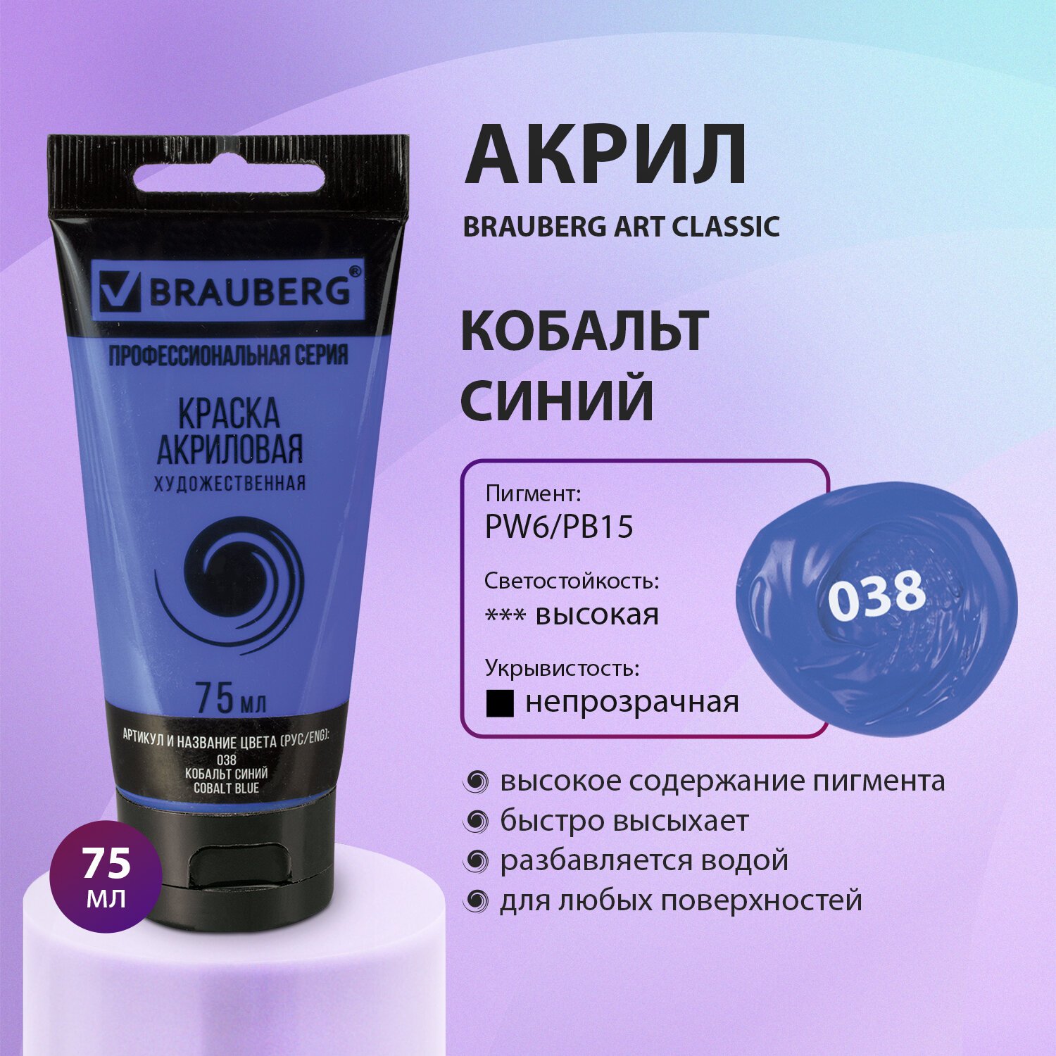 Краска акриловая художественная BRAUBERG ART CLASSIC, туба 75мл, КОБАЛЬТ СИНИЙ, 191094