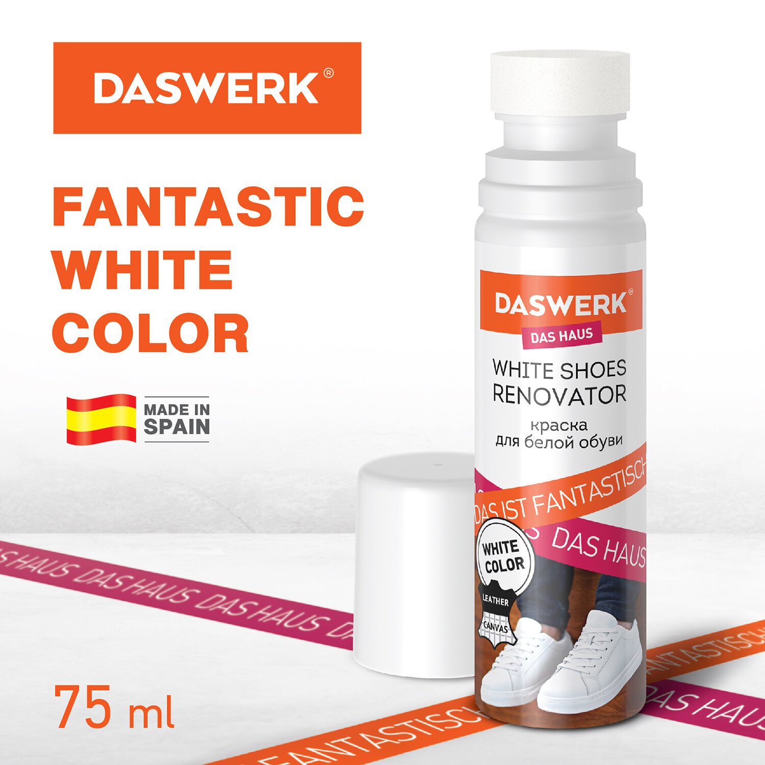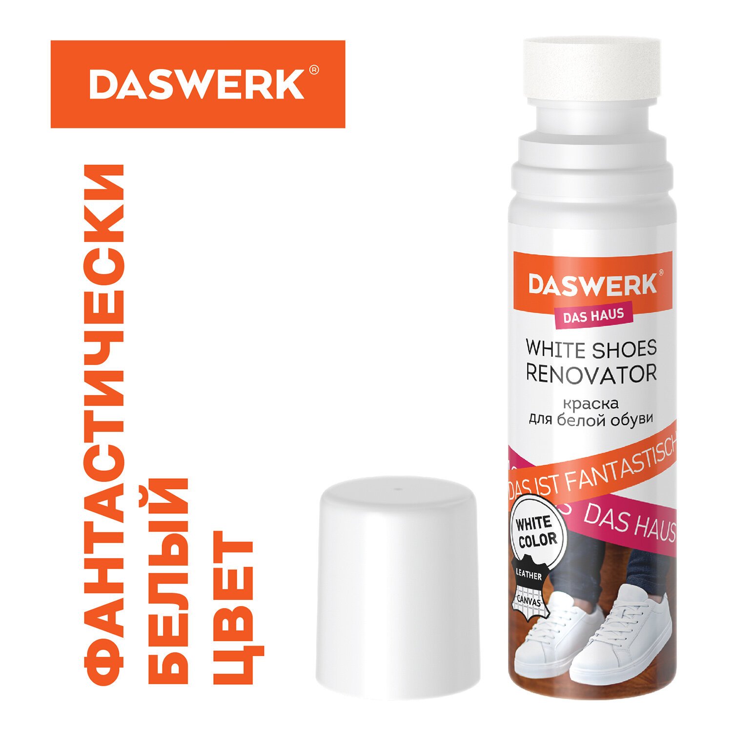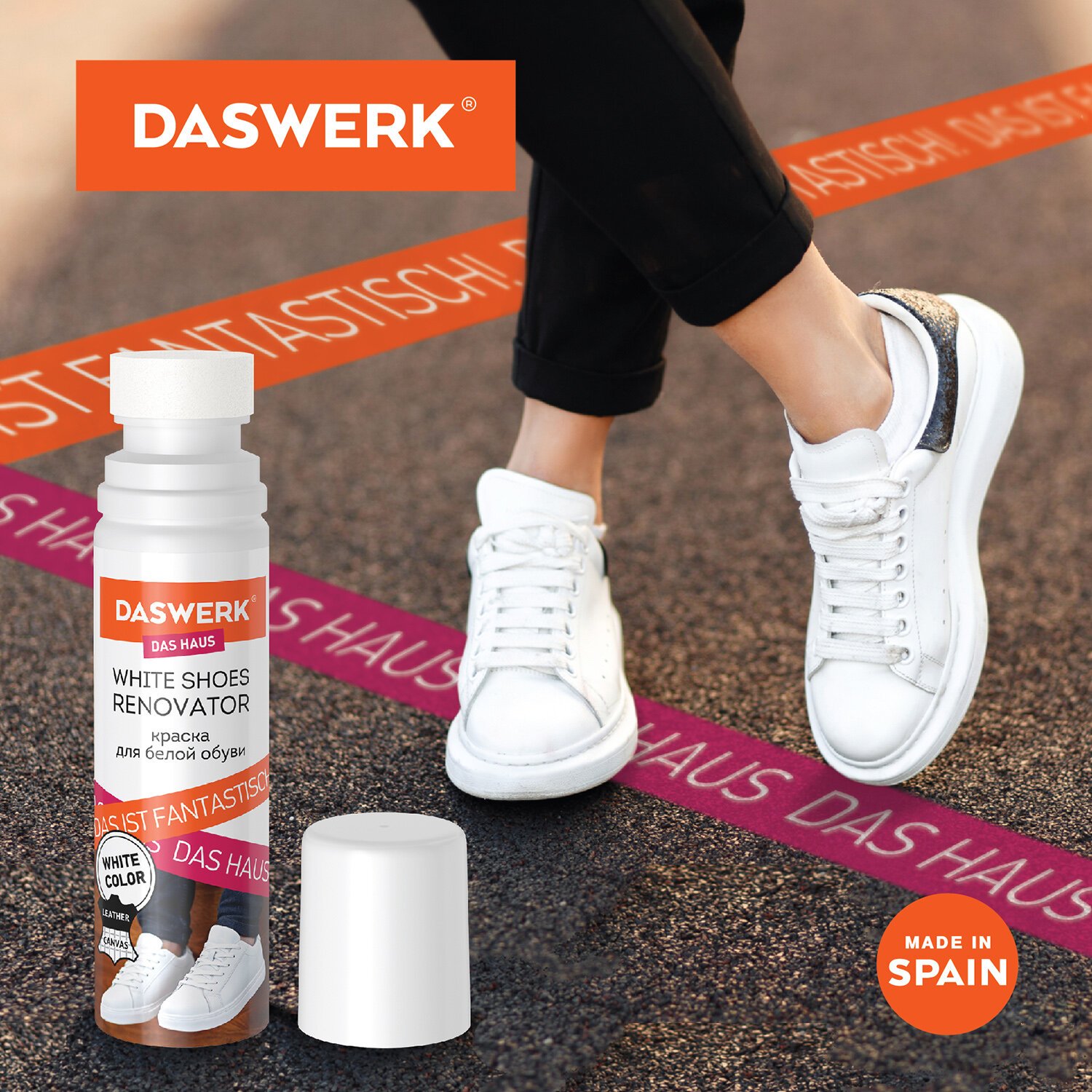 Высокоэффективная жидкая крем-краска DASWERK на водной основе для обновления и восстановления внешнего вида белой обуви, аксессуаров и других изделий из кожи и текстиля. Удобный аппликатор позволяет равномерно обработать все изделие.
