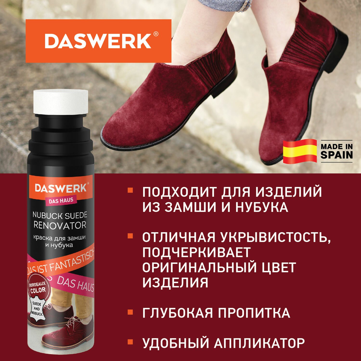 Высокоэффективная жидкая краска DASWERK для обновления и восстановления внешнего вида обуви и других аксессуаров из замши и нубука. Эффективно обновляет первоначальный цвет изделия, закрашивает и маскирует выцветшие участки.
