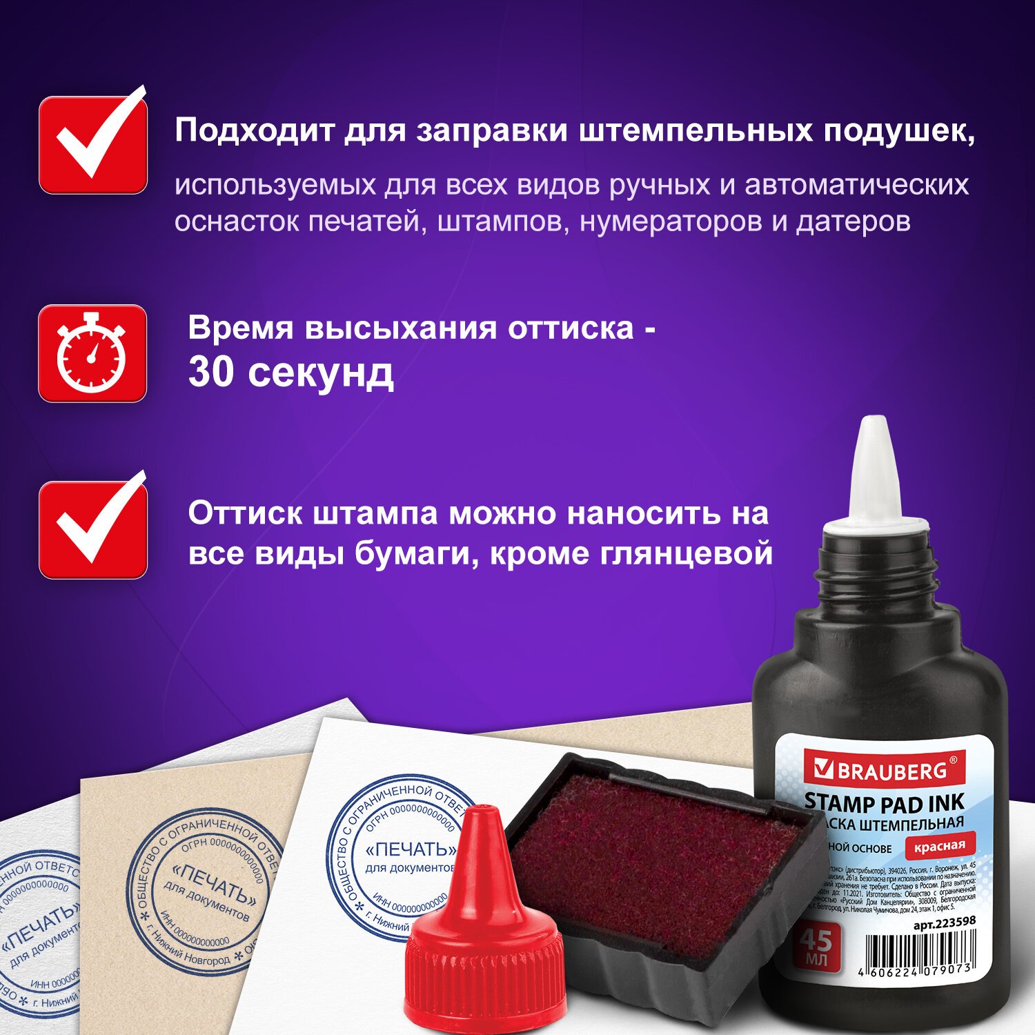 Оттиск штампа можно наносить на все виды бумаги, кроме глянцевой. Высококачественные чернила красного цвета на водной основе. Время высыхания оттиска – 30 секунд. Удобный пластиковый флакон с дозатором. Объем – 45 мл.