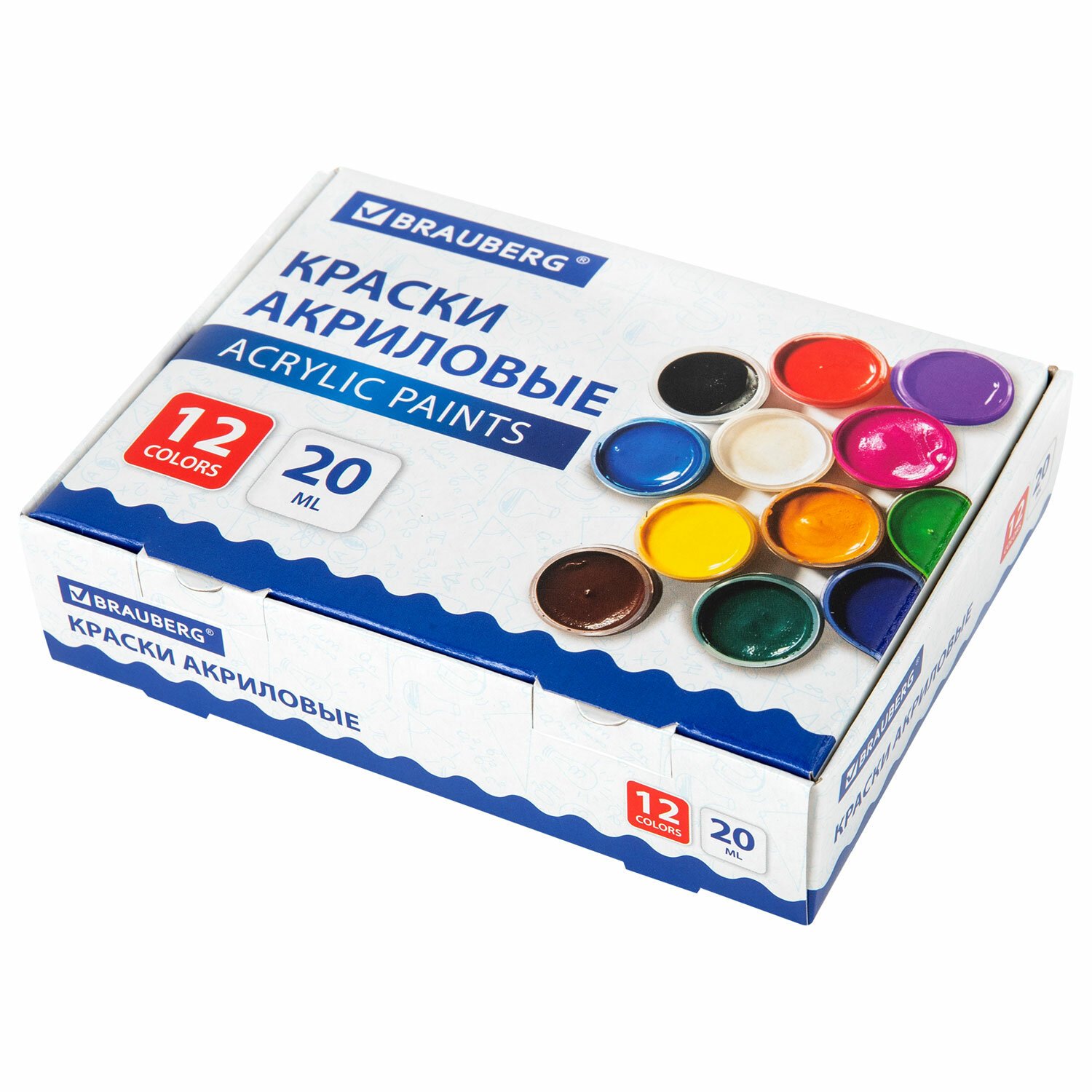 Краски акриловые для рисования и творчества 12 цветов по 20 мл, BRAUBERG, 192564