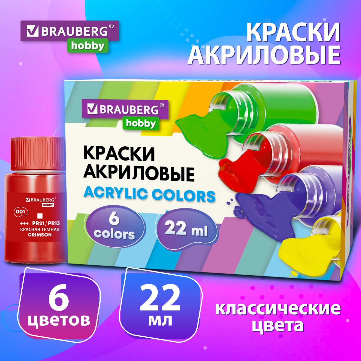 Краски акриловые художественные 6 цветов в банках по 22 мл, BRAUBERG HOBBY, 192409