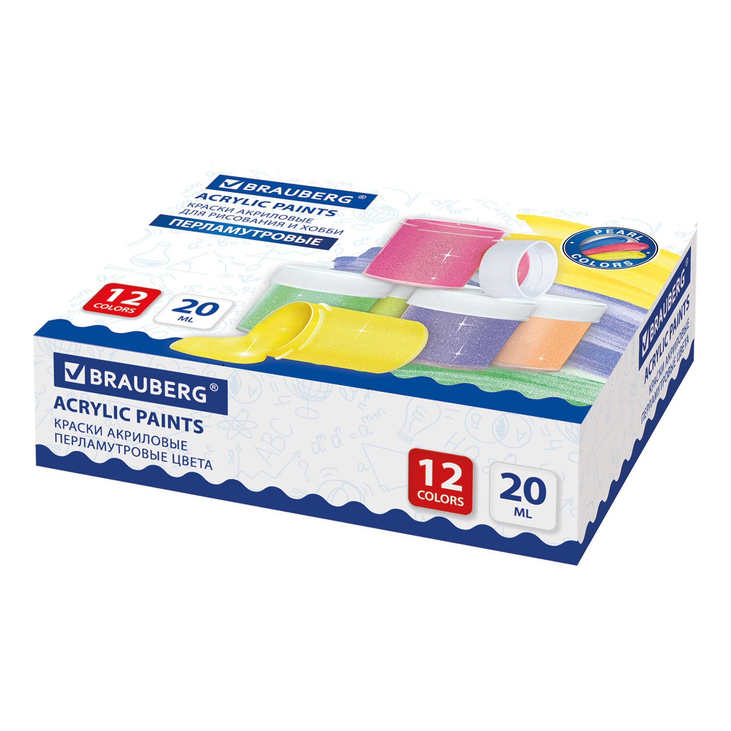Краски акриловые ПЕРЛАМУТРОВЫЕ для рисования и хобби BRAUBERG 12 цветов по 20 мл, 191604