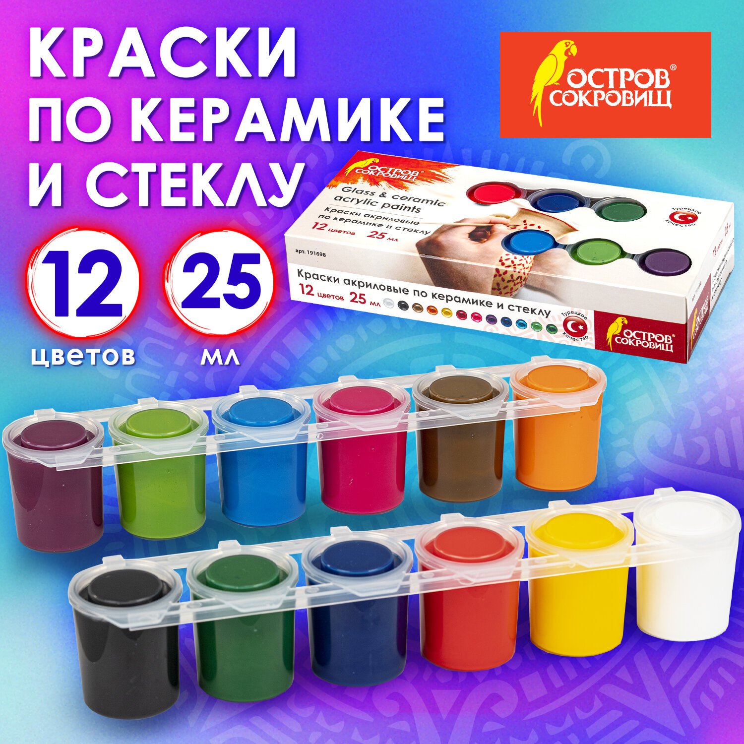 Краски акриловые по керамике и стеклу ОСТРОВ СОКРОВИЩ 12 цветов по 25 мл, 191698