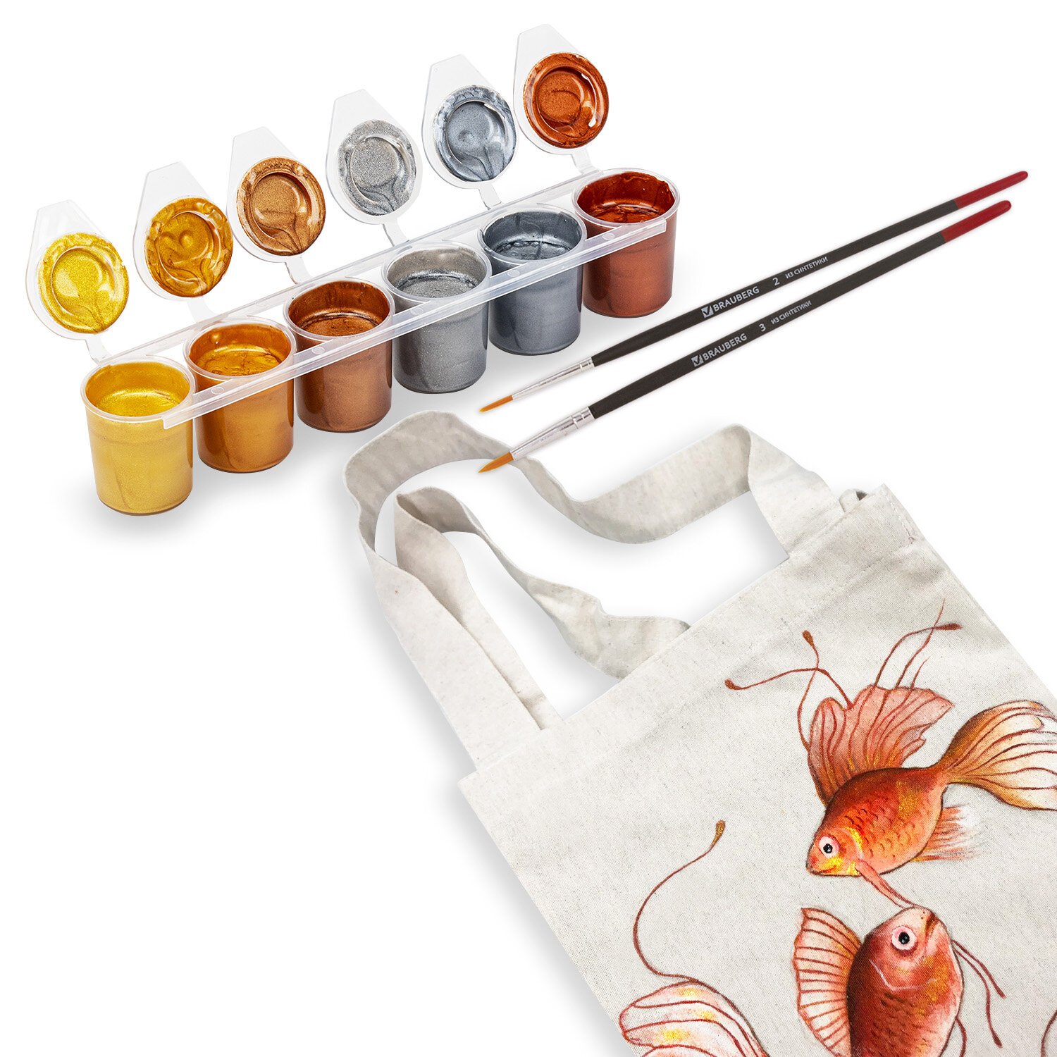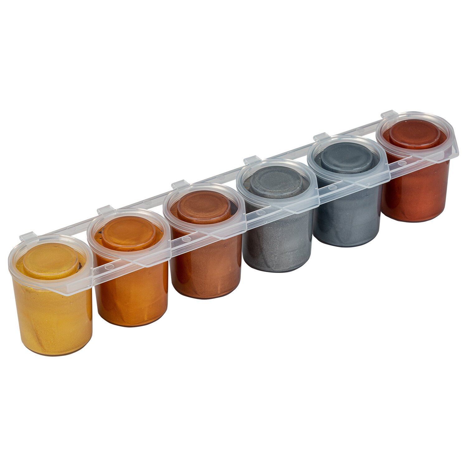 В наборе 6 насыщенных цветов с эффектом металлик: золото, античное золото, бронза, серебро, античное серебро, медь. Краски обладают высокой кроющей способностью, отлично смешиваются, не тускнеют после высыхания и не выгорают при воздействии солнечных лучей.