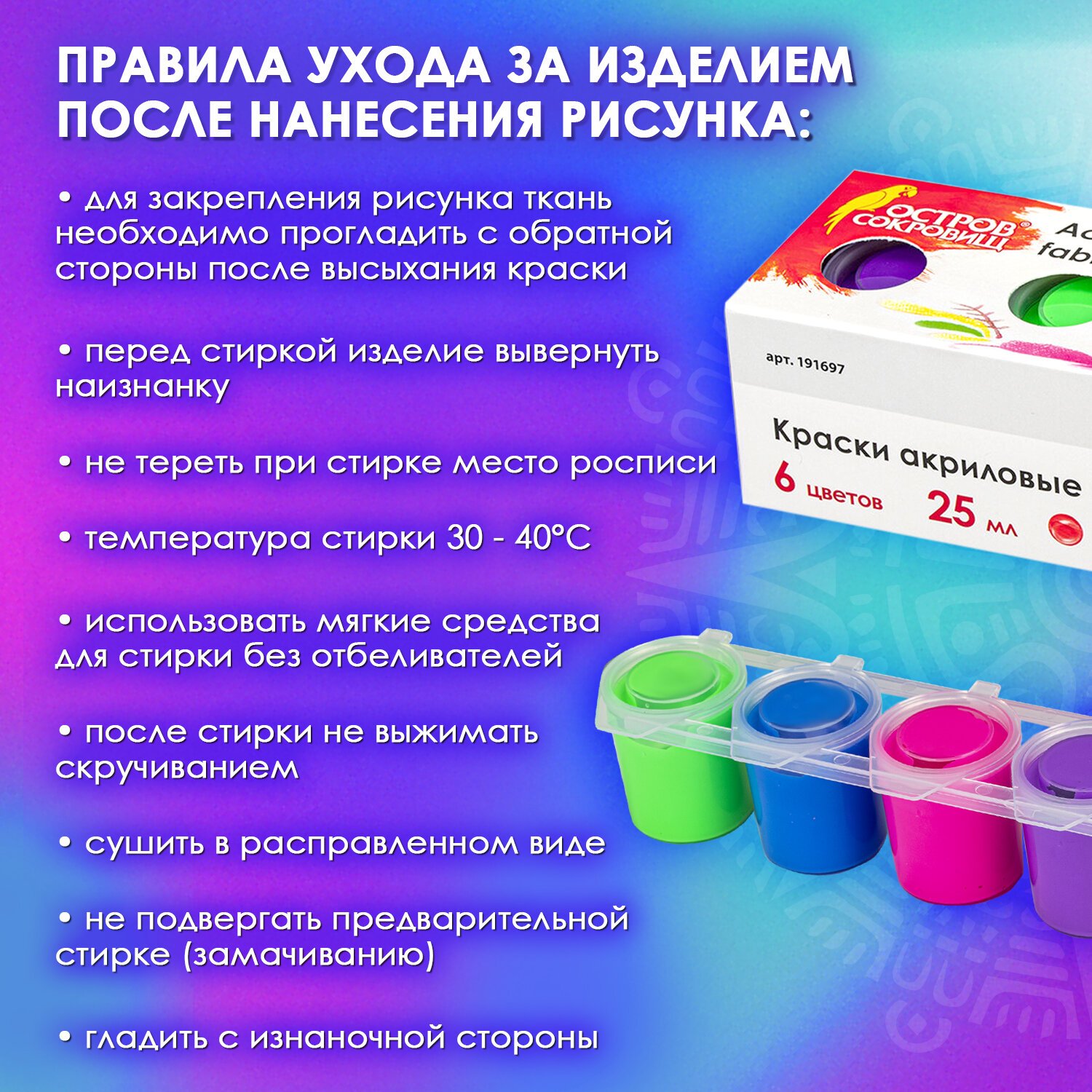 Краски акриловые по ткани ОСТРОВ СОКРОВИЩ 6 цветов по 25 мл, 191693