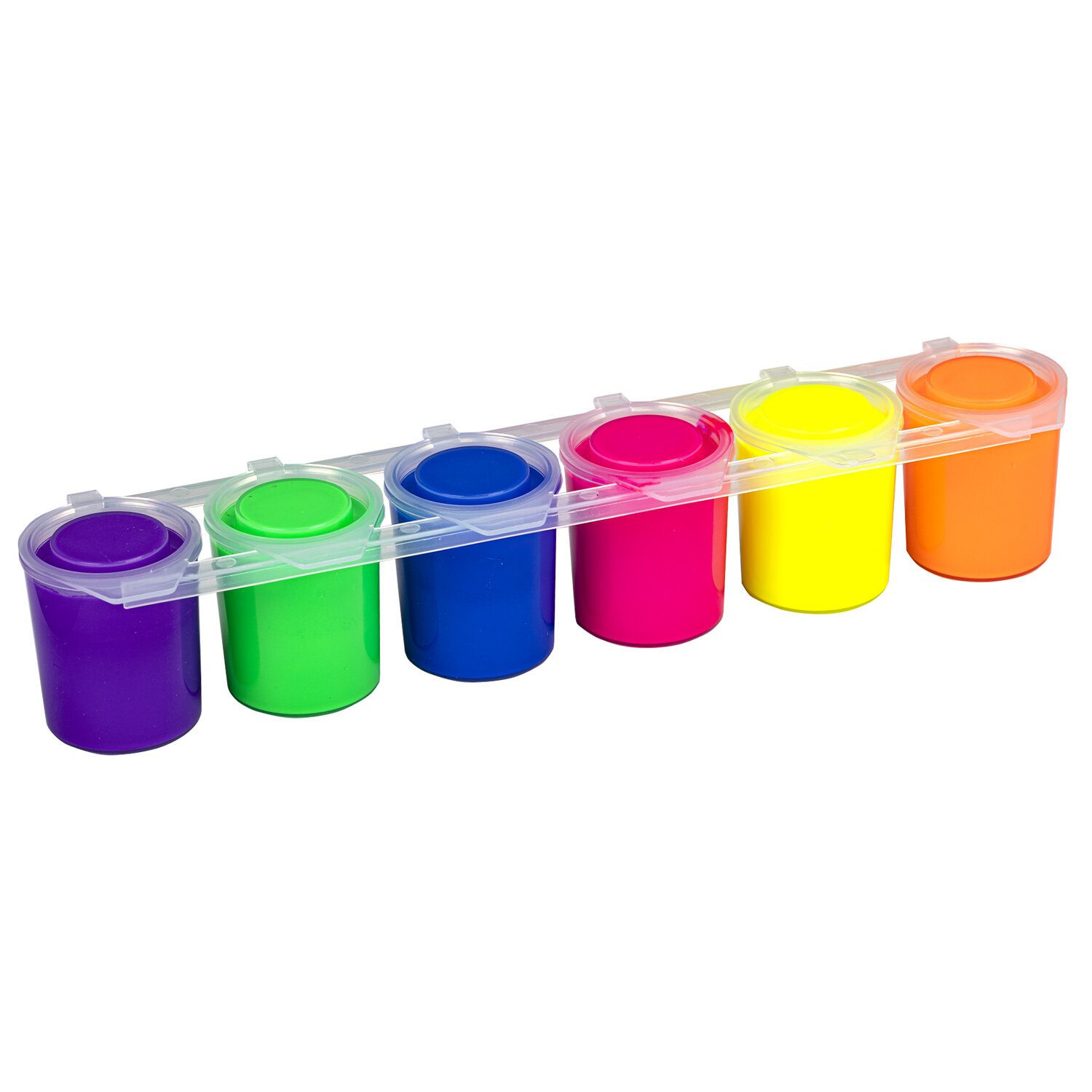 В наборе 6 насыщенных неоновых цветов: голубой, желтый, зеленый, оранжевый, розовый, фиолетовый. Краски обладают высокой кроющей способностью, отлично смешиваются, не тускнеют после высыхания и не выгорают при воздействии солнечных лучей.