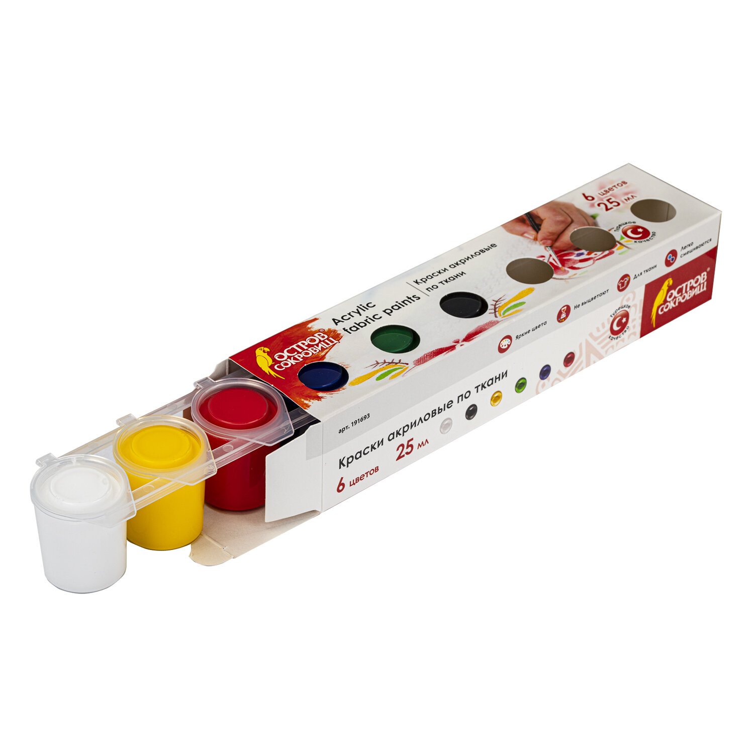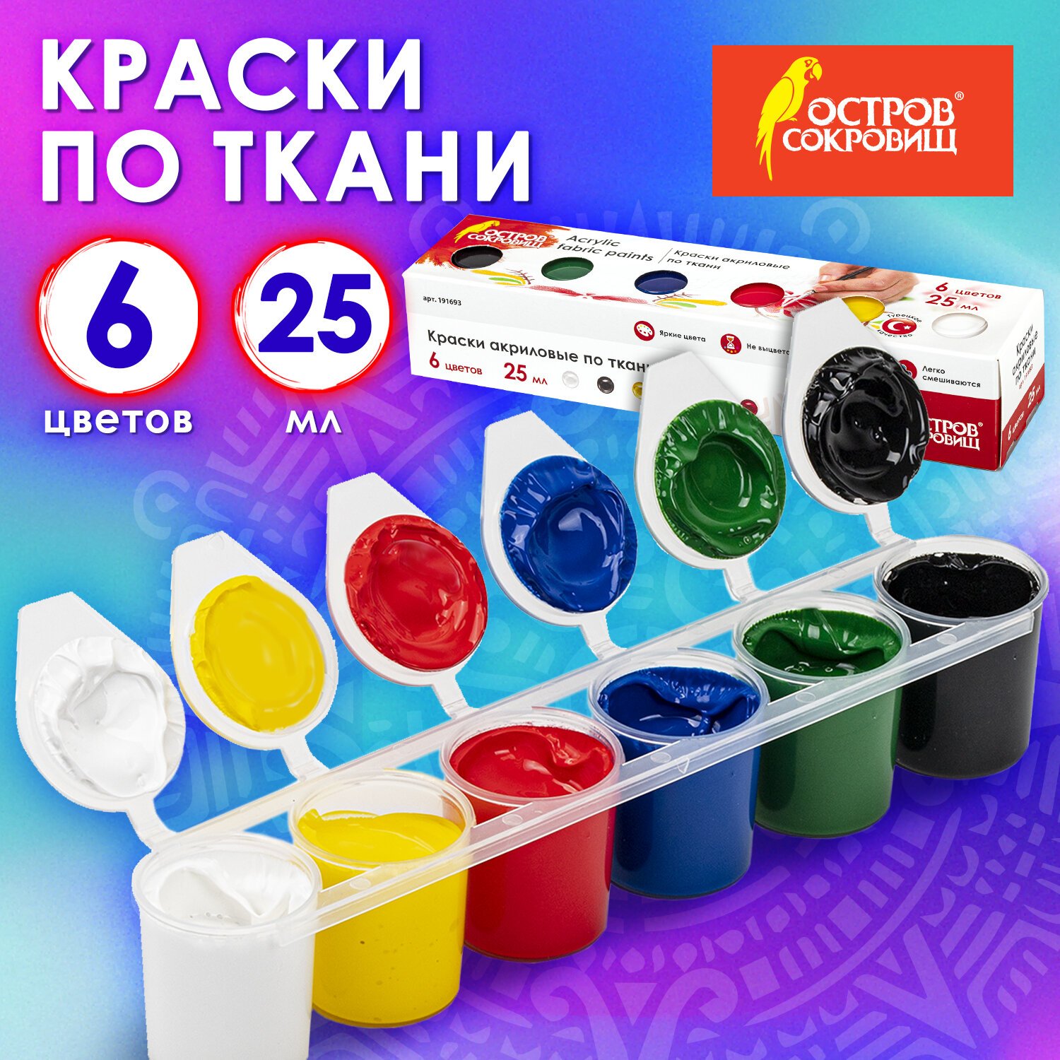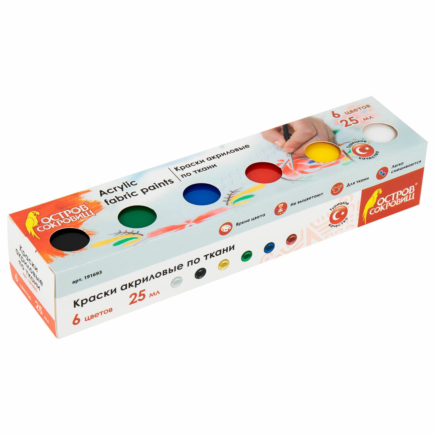 Краски акриловые по ткани ОСТРОВ СОКРОВИЩ 6 цветов по 25 мл, 191693