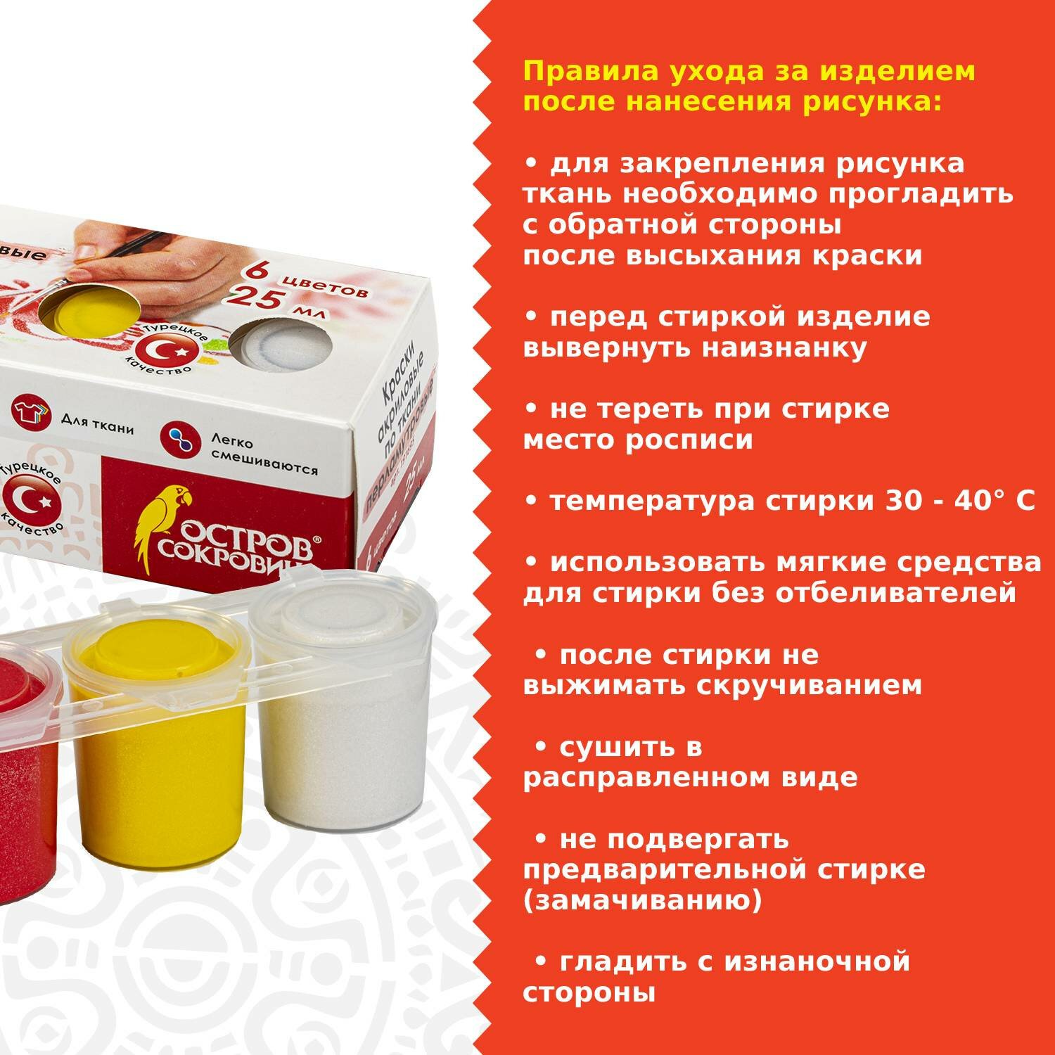 Краски акриловые по ткани ОСТРОВ СОКРОВИЩ 6 цветов по 25 мл, 191693