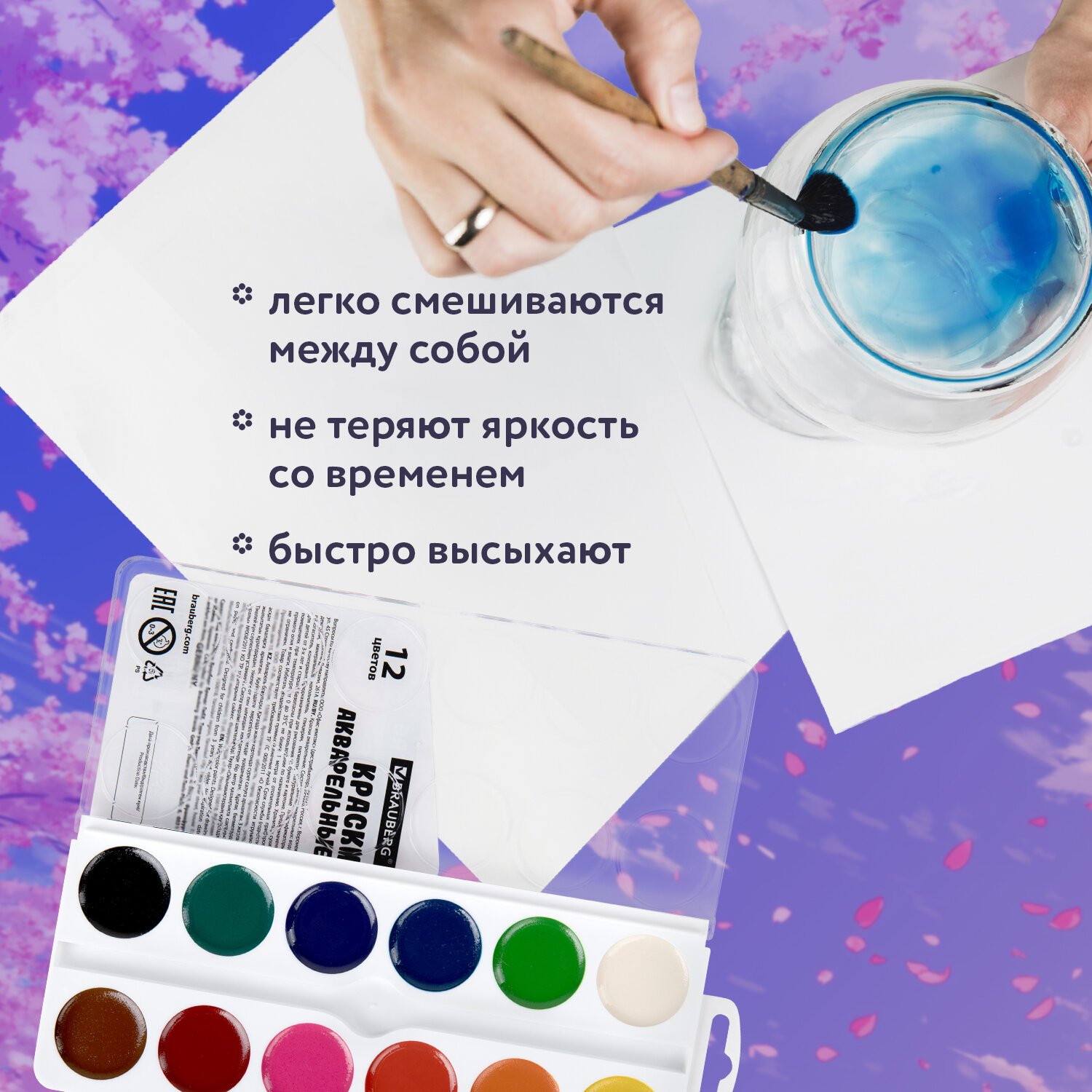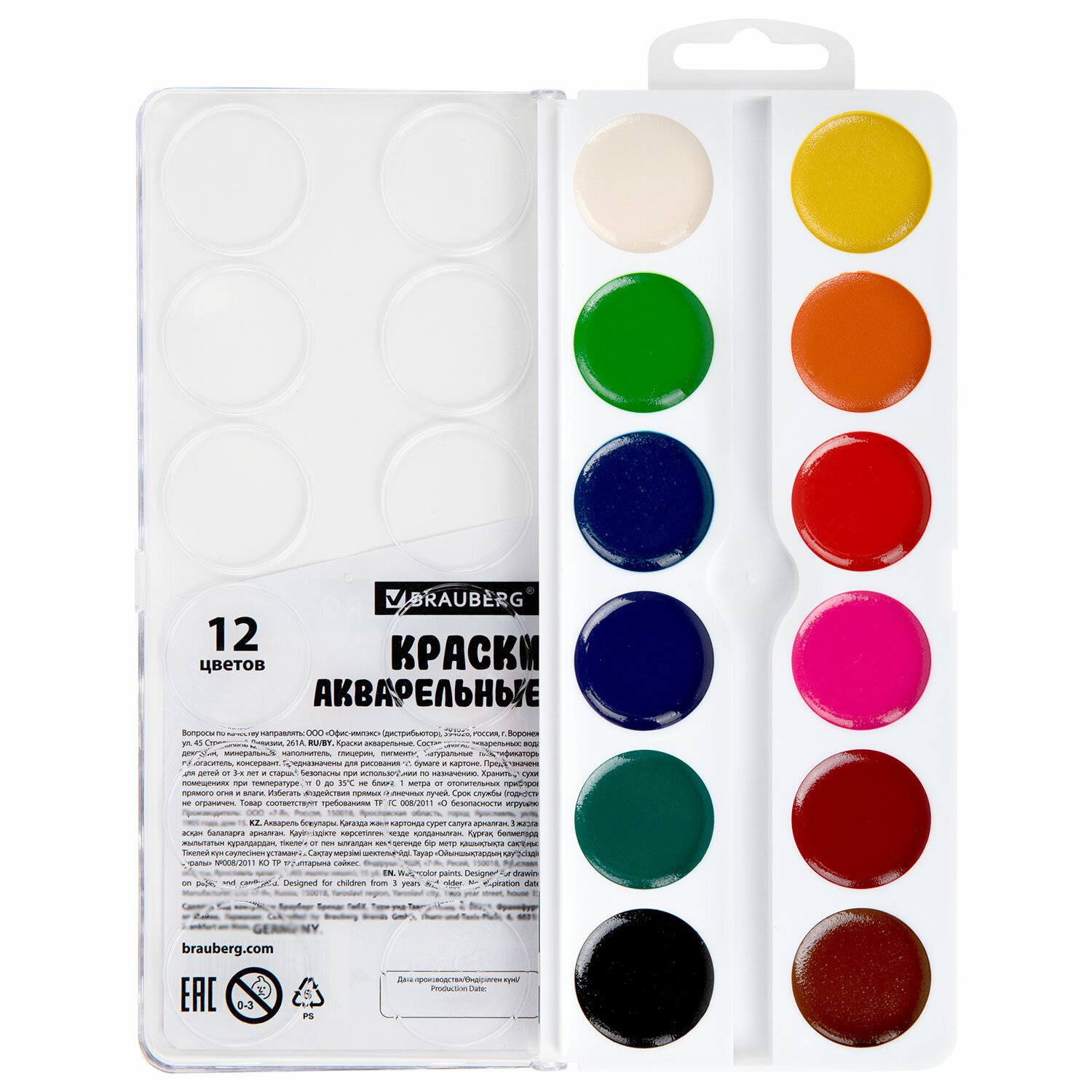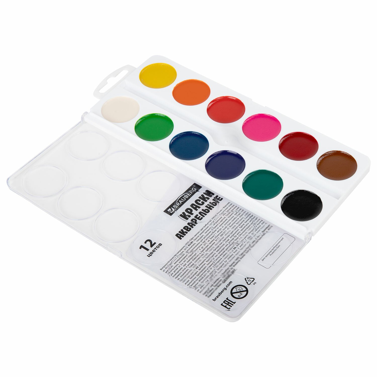 Краски акварельные BRAUBERG KIDS, 12 ярких цветов, круглые кюветы, пластиковый пенал, 191806