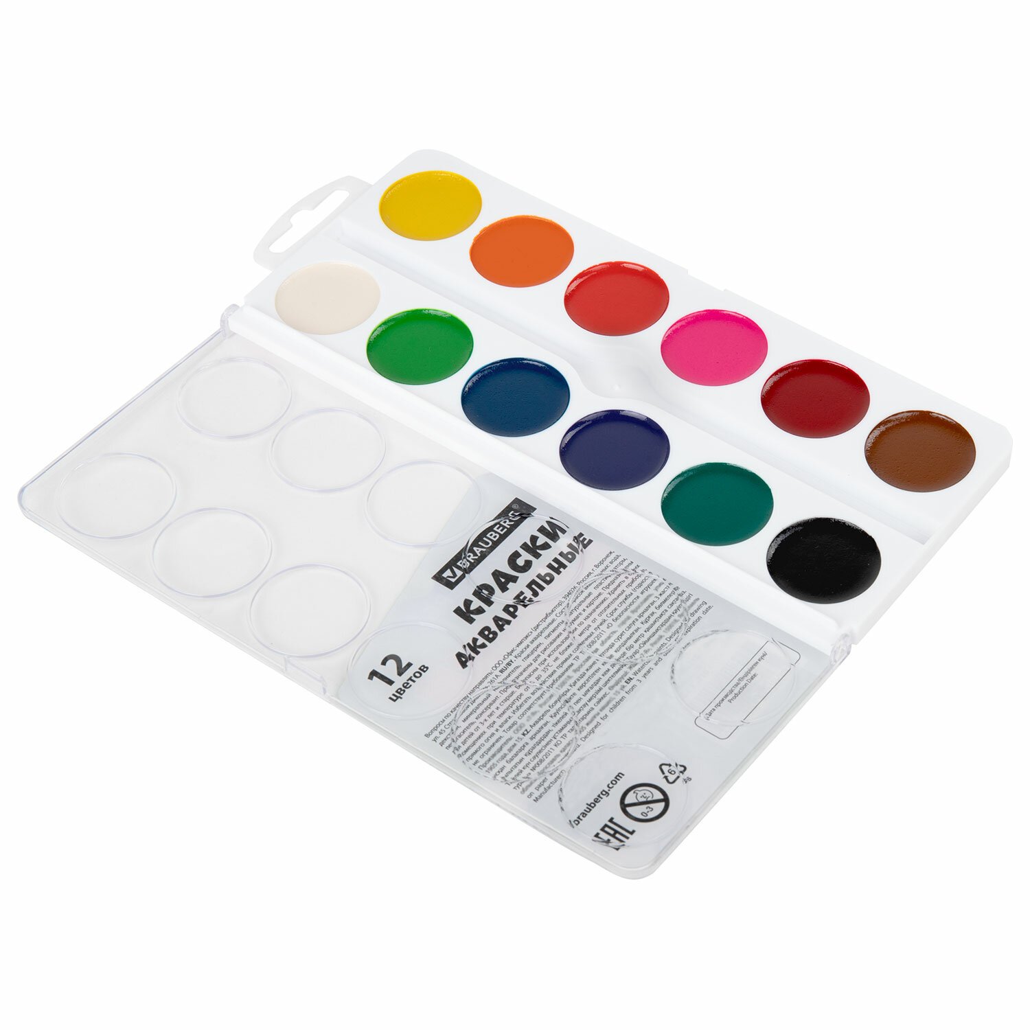 Краски акварельные BRAUBERG KIDS, 12 ярких цветов, круглые кюветы, пластиковый пенал, 191806