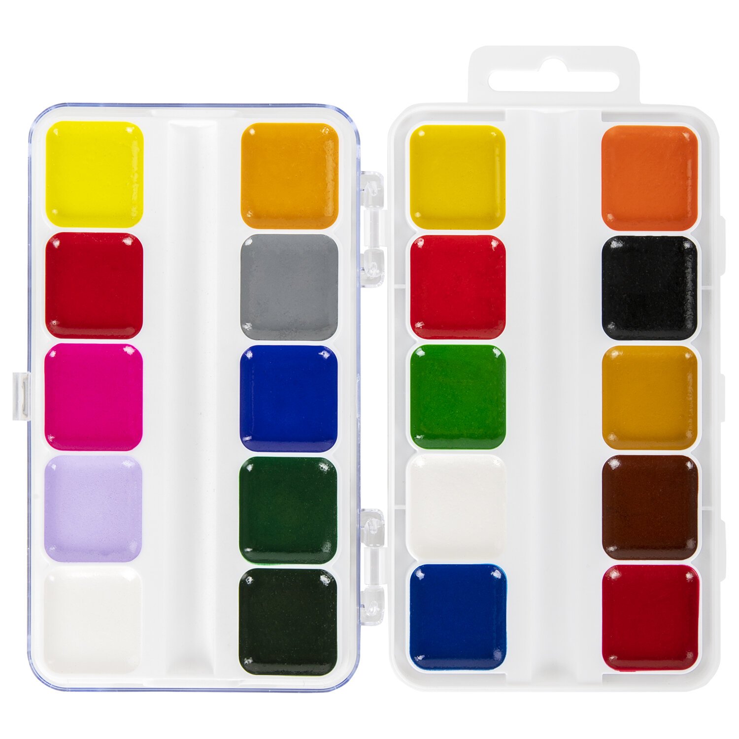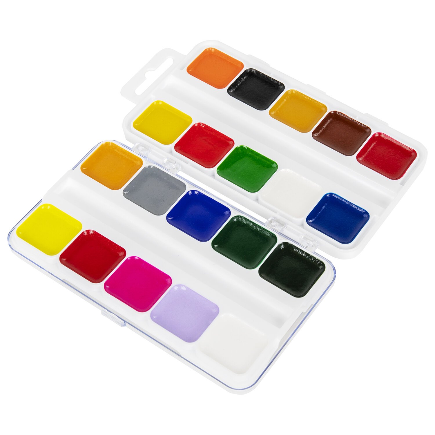 20 ярких насыщенных цветов отлично смешиваются между собой и позволяют создать множество оттенков, обеспечивают однородное окрашивание. Краски быстро высыхают и не портятся со временем. Нетоксичны и безопасны для детей. Выпускаются в пластиковом пенале с европодвесом, прозрачной крышкой, квадратной формой кювет и отделением для кисточки. Упаковка обладает компактными размерами и легким весом.