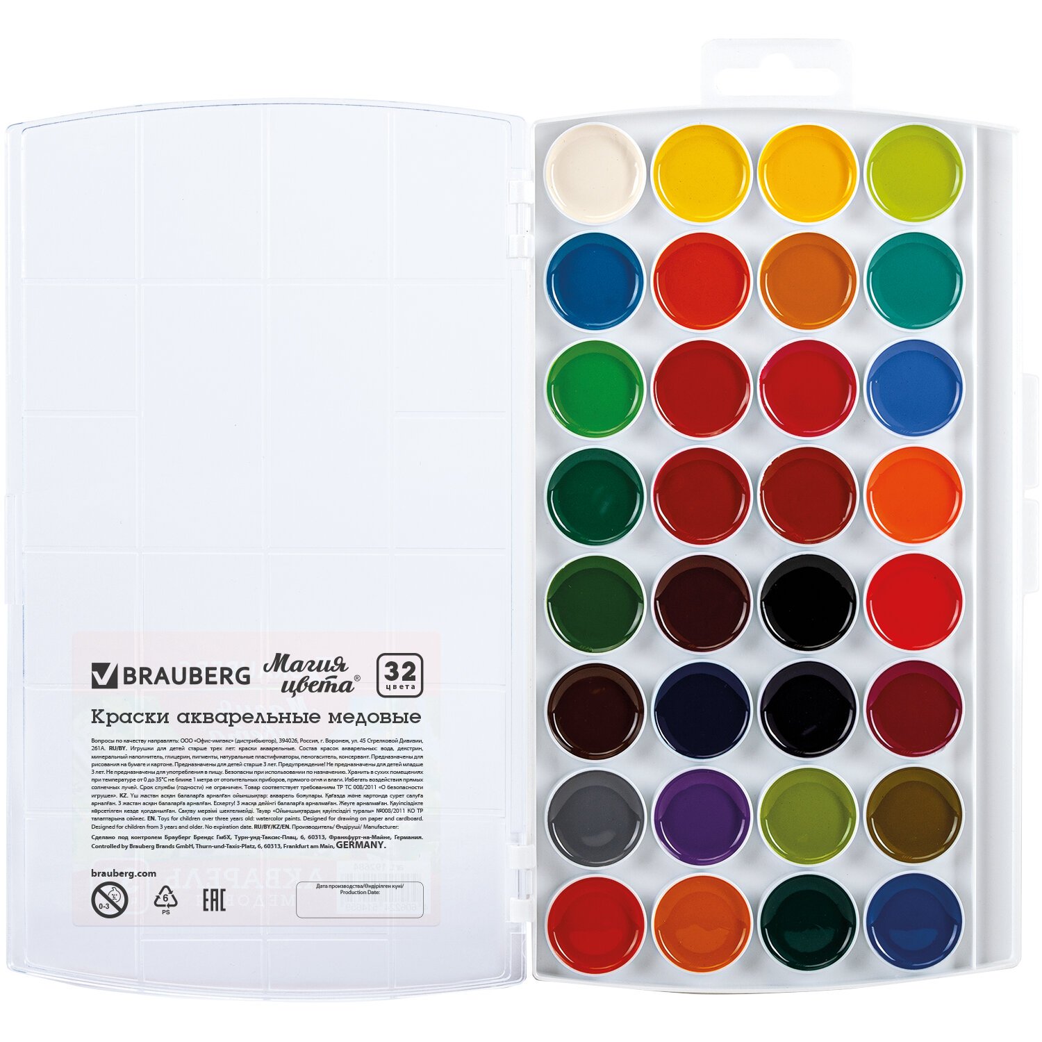 Краски акварельные BRAUBERG "МАГИЯ ЦВЕТА" 32 цвета, медовые, круглые кюветы, пенал, 192684