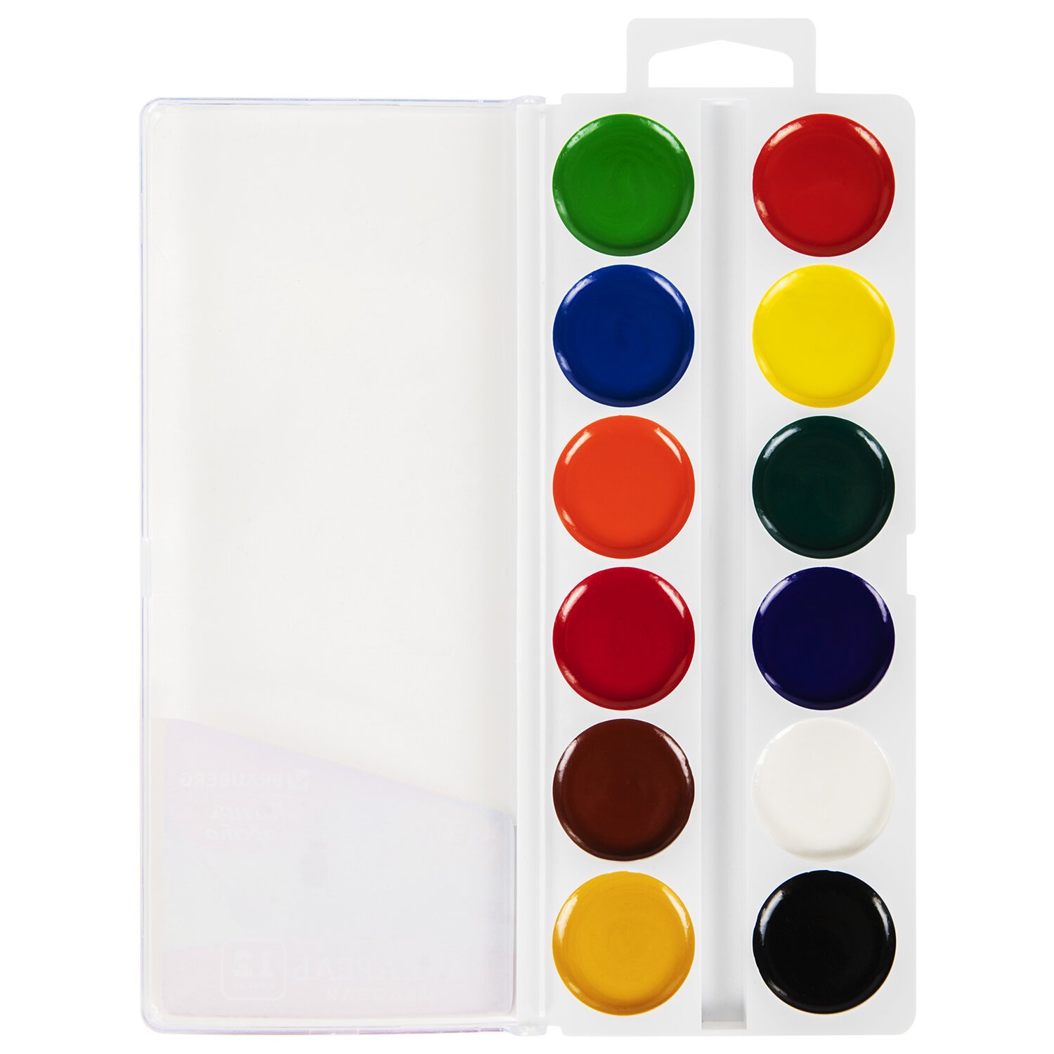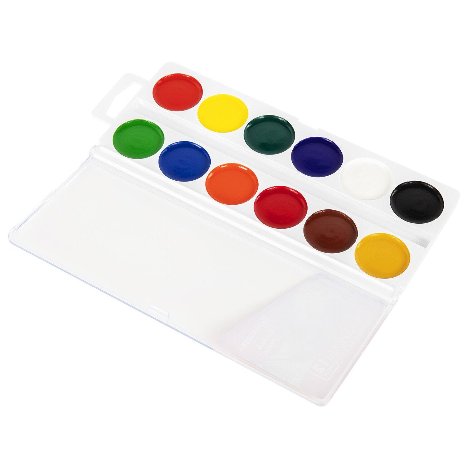 12 ярких насыщенных цветов отлично смешиваются между собой и позволяют создать множество оттенков, обеспечивают однородное окрашивание. Краски быстро высыхают и не портятся со временем. Безопасны для детей, нетоксичны. Идеально подойдут для детского творчества и художественного изобразительного искусства. Краски выпускаются в пластиковом пенале с европодвесм, прозрачной крышкой, круглой формой кювет и отделением для кисточки. Упаковка обладает компактными размерами и легким весом.