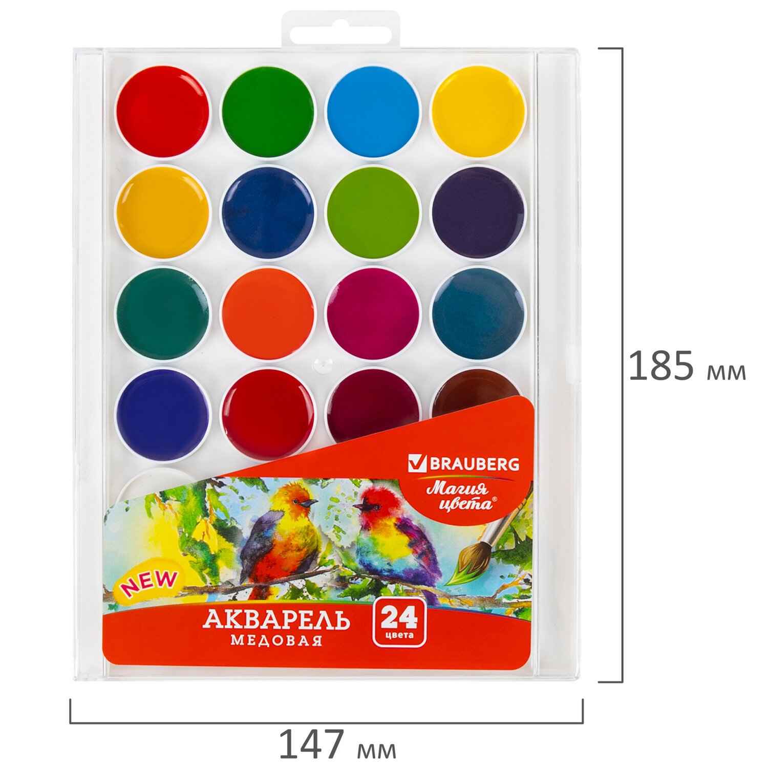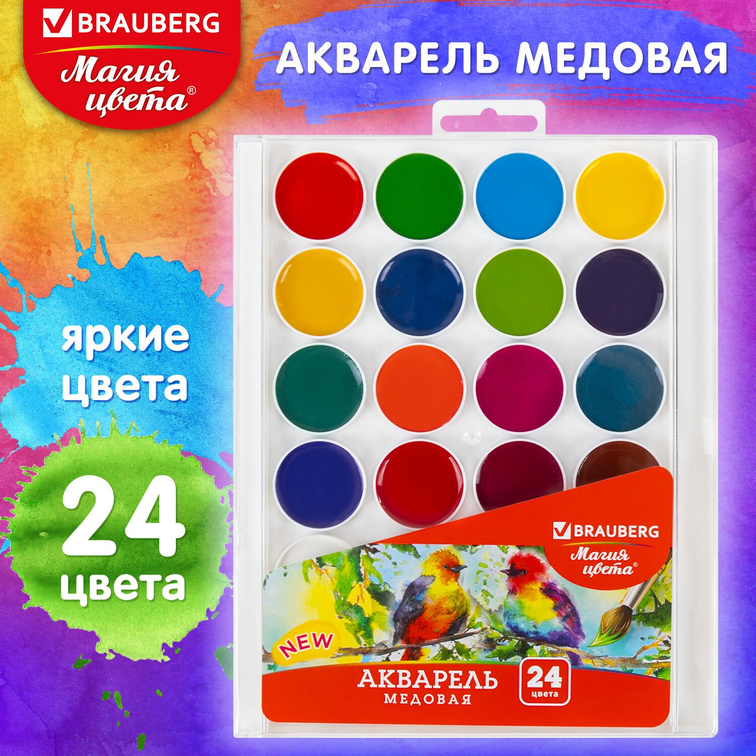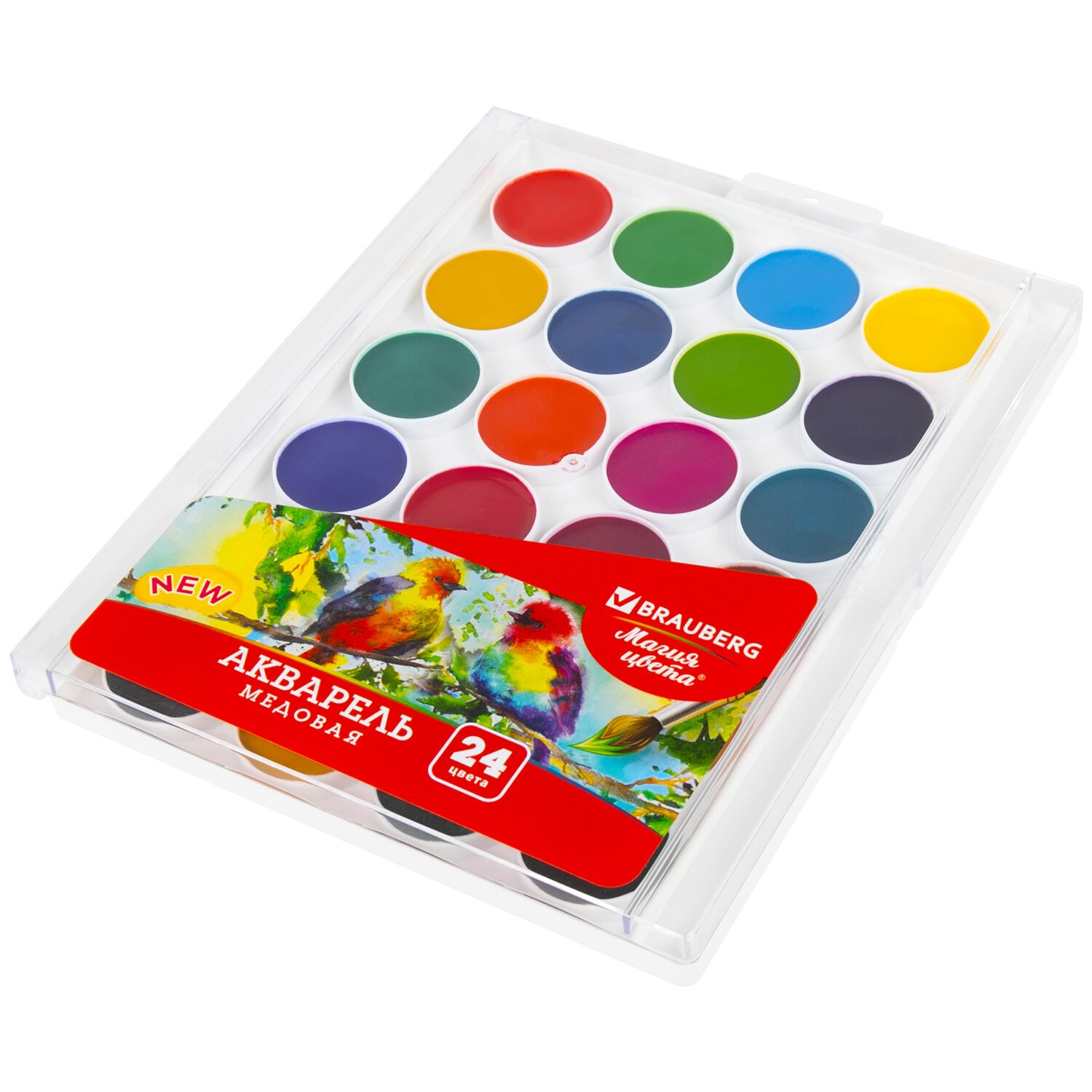 Краски акварельные BRAUBERG "МАГИЯ ЦВЕТА NEW", медовые, 24 цвета, круглые кюветы, пластиковый пенал, 192365