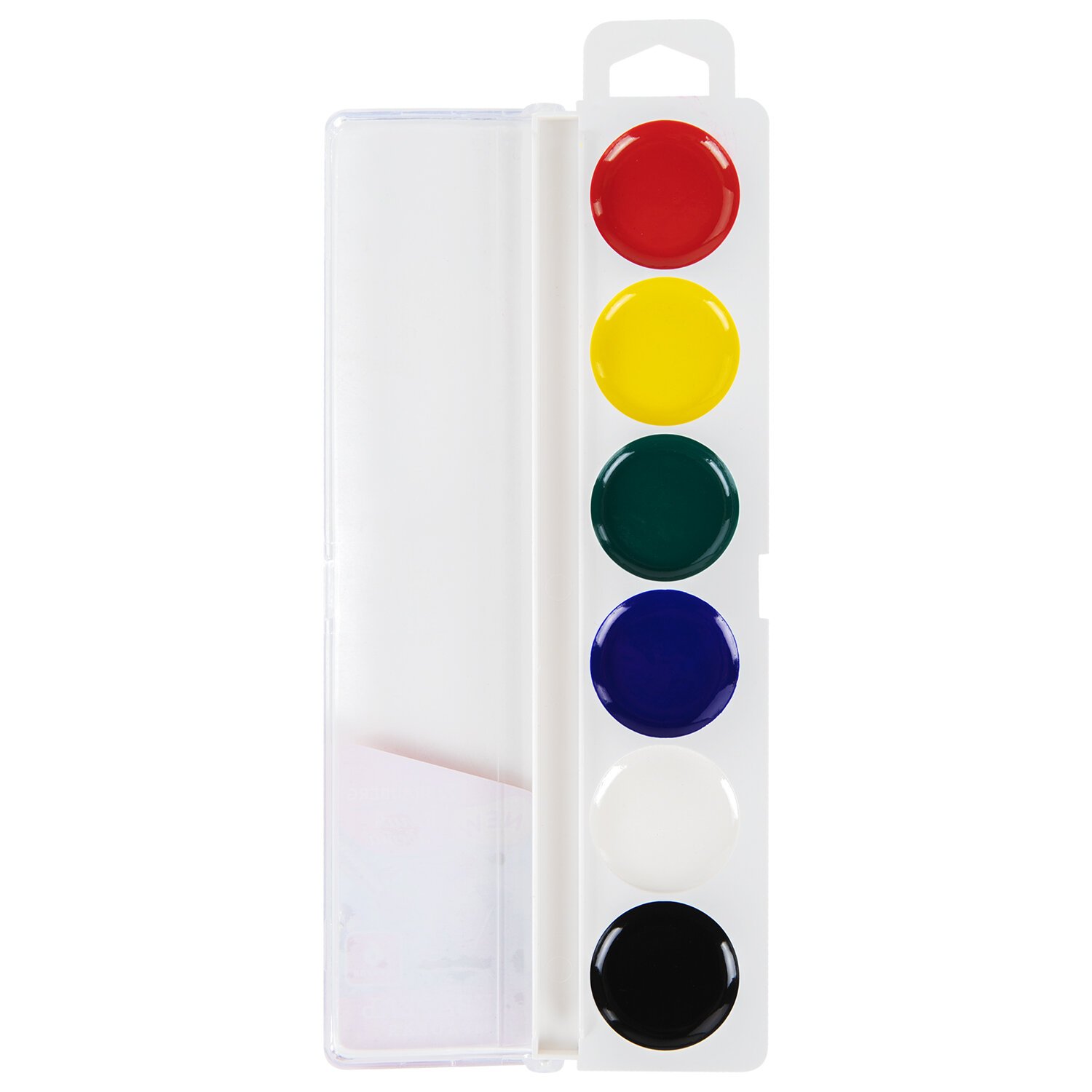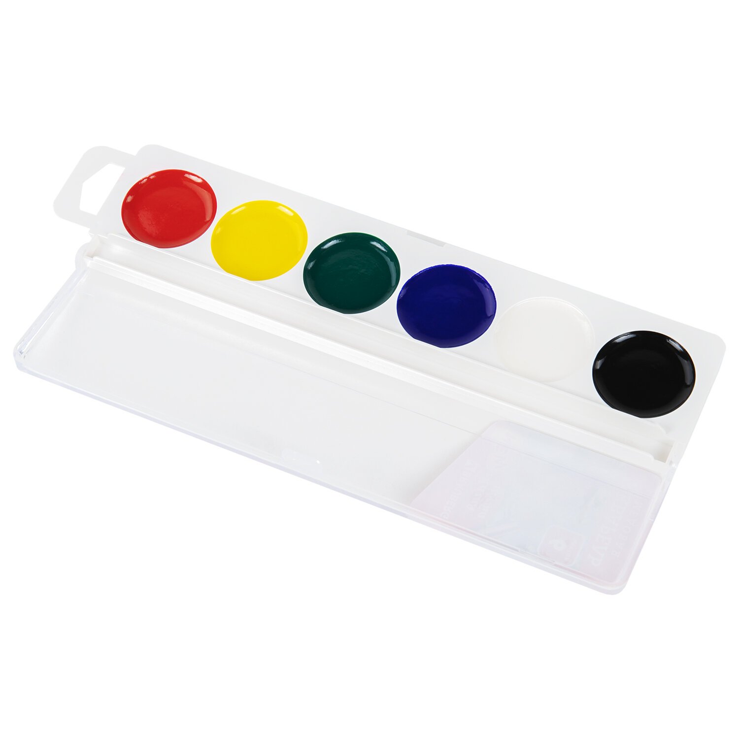 6 ярких насыщенных цветов отлично смешиваются между собой и позволяют создать множество оттенков, обеспечивают однородное окрашивание. Краски быстро высыхают и не портятся со временем. Безопасны для детей, нетоксичны. Идеально подойдут для детского творчества и художественного изобразительного искусства. Краски выпускаются в пластиковом пенале с европодвесом, прозрачной крышкой, круглой формой кювет и отделением для кисточки. Упаковка обладает компактными размерами и легким весом.