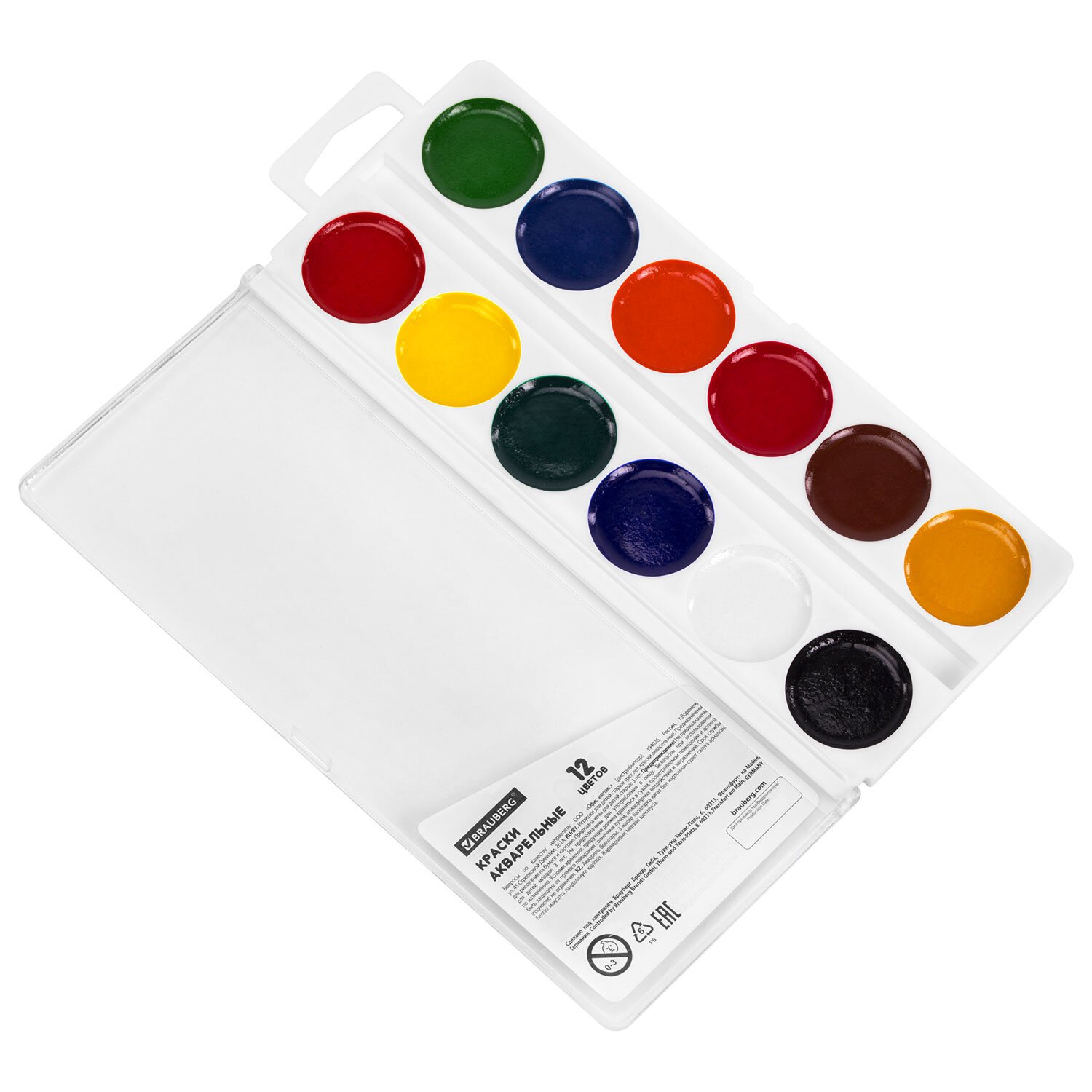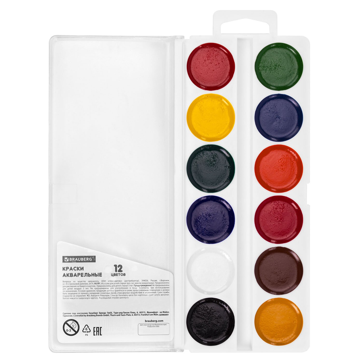 Краски акварельные BRAUBERG KIDS, 12 ярких цветов, круглые кюветы, пластиковый пенал, 191806