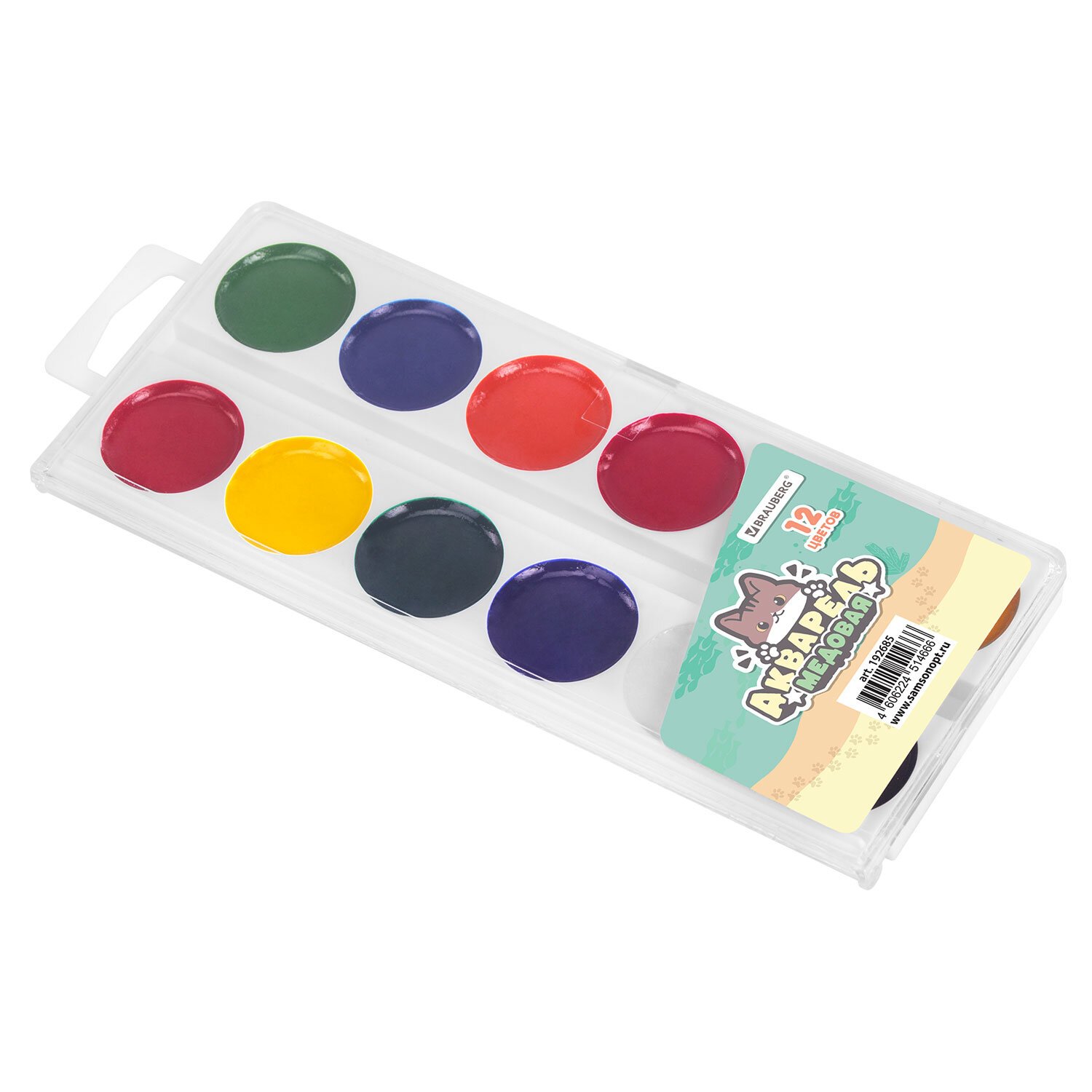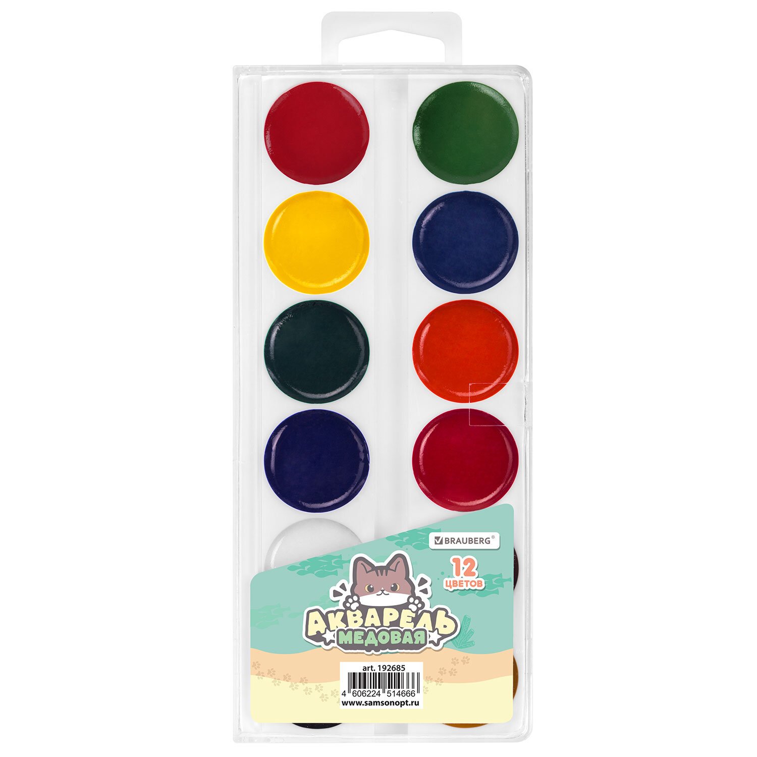 Краски акварельные BRAUBERG "МИЛЫЕ КОТЫ", медовые, 12 цветов, круглые кюветы, 192685