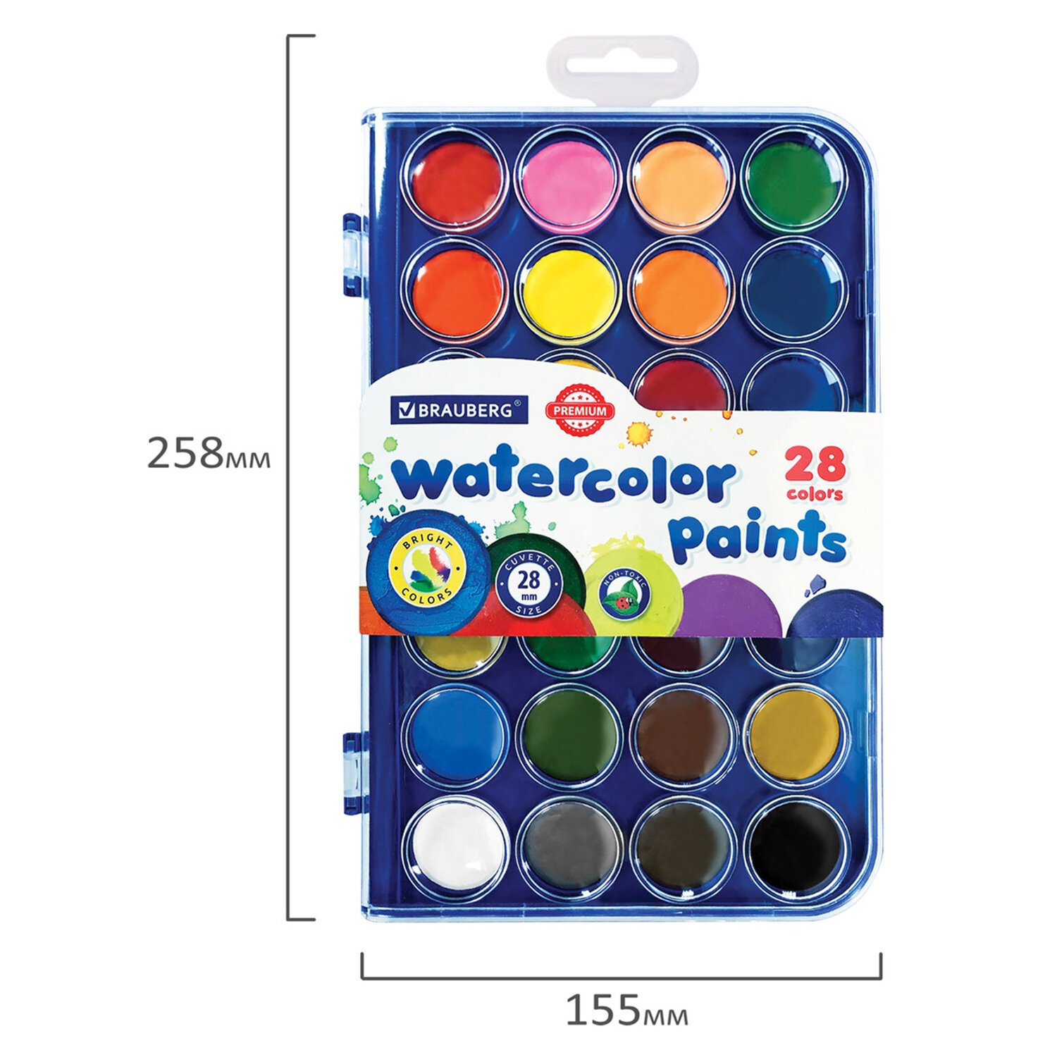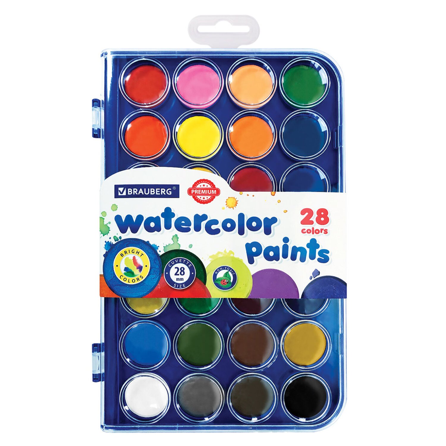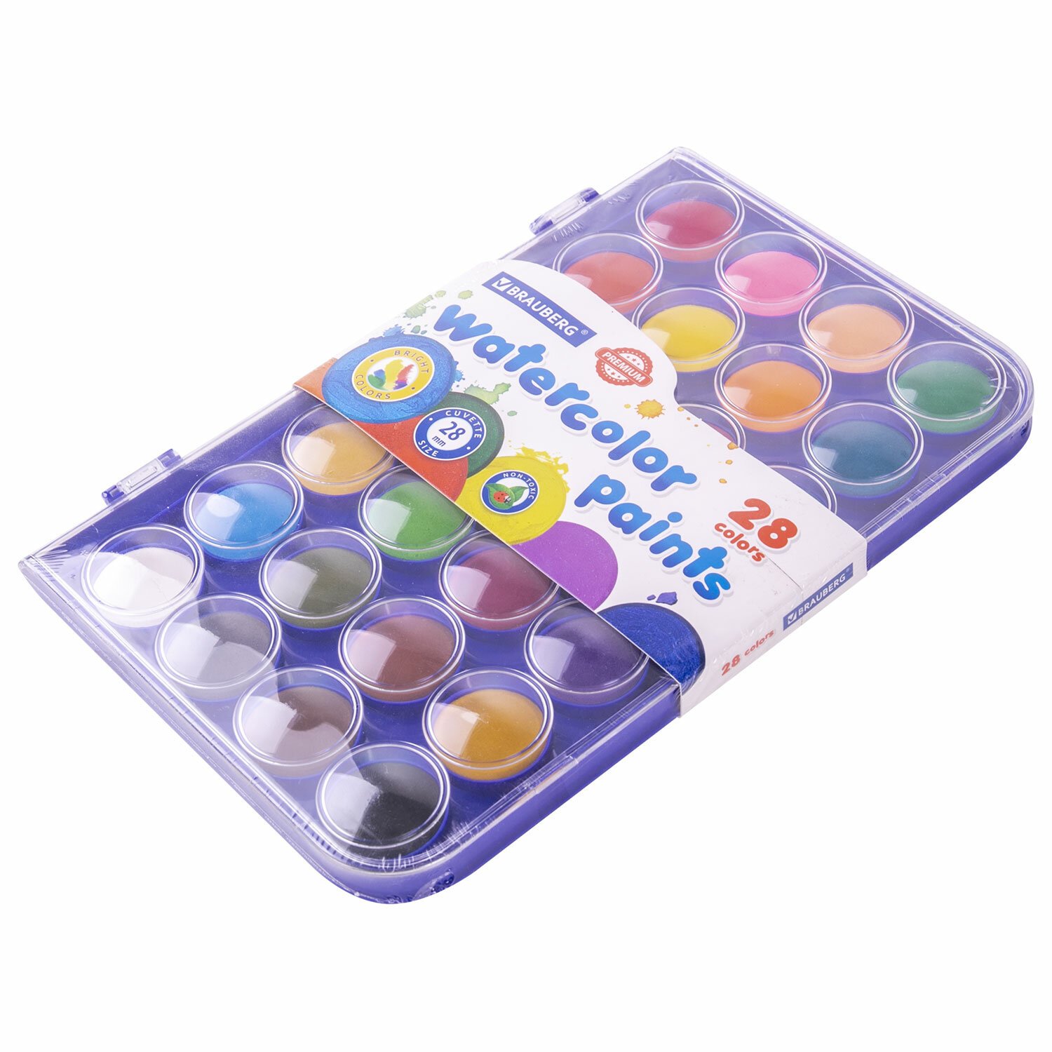 Краски акварельные BRAUBERG "PREMIUM" 28 цветов, круглые кюветы 28 мм, пенал, 191745